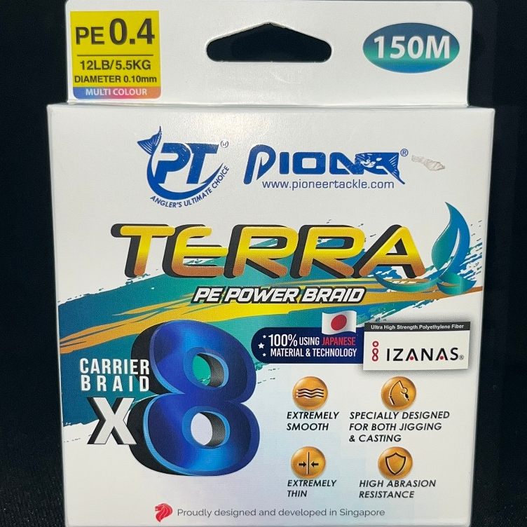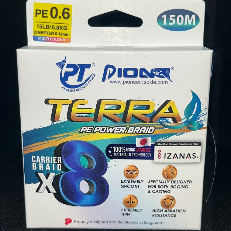 สาย Pionerr TERRA X8 รุ่นใหม่ล่าสุด ความยาว 150 m (สลับสี) สายรุ่นใหม่ จาก ค่าย Pionerr รุ่น TERRA ถัก8 ความยาว 150 m มีทั้งหมด 5 ขนาด Pe0.4 รับแรงดึงได้ 12LB หรือ 5.5KG Pe0.6 รับแรงดึงได้ 15LB หรือ 6.8KG Pe1.0 รับแรงดึงได้ 20LB หรือ 9.1KG Pe2.0 ร