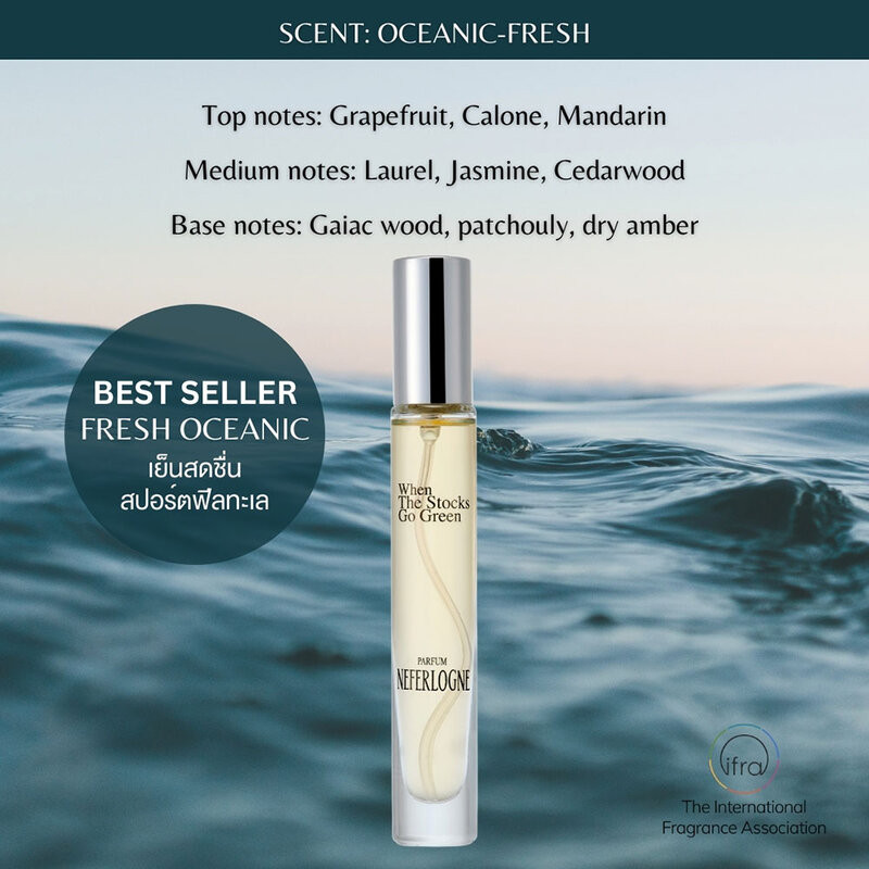 NEFERLOGNE When The Stocks Go Green Perfume 10ml สัมผัสกลิ่นหอมอย่างมีระดับด้วยน้ำหอมระดับพรีเมียมที่คัดสรรวัตถุดิบจากทั่วโลกซึ่งผ่านการรองรับมาตรฐานจากสมาคมน้ำหอมนานาชาติ (IFRA) พบกับความโดดเด่นด้วยกลิ่นหอมสดชื่นจากเกรปฟรุตและเปลือกส้มแมนดาริน สวยสง่าดั่