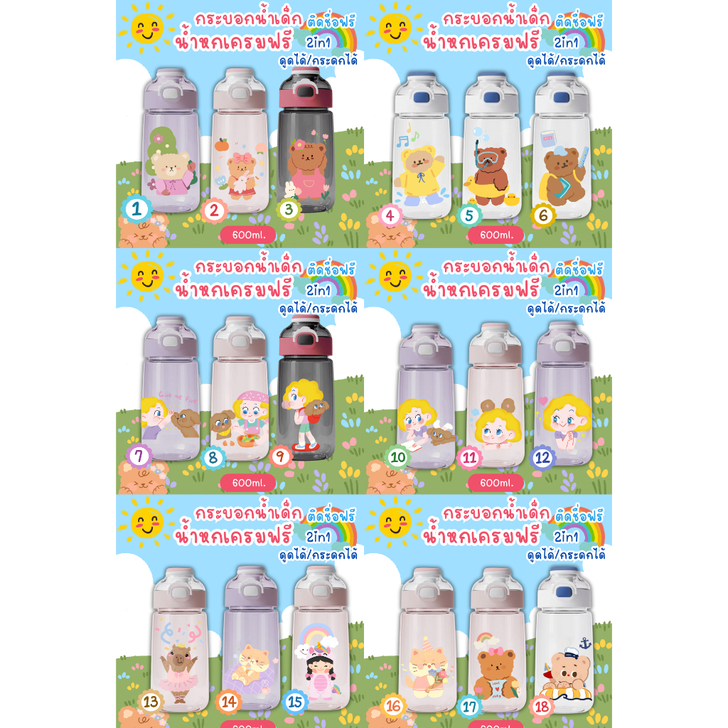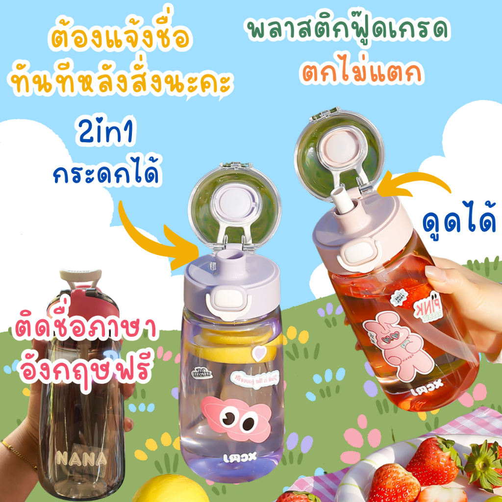 กระบอกน้ำเด็ก 2in1 มีสาย (ติดชื่อฟรี) ขวดน้ำ กระติกน้ำ ดูดได้/กระดกได้ หลอดกดกระเด้ง เอาหลอดออกได้ 600ml.