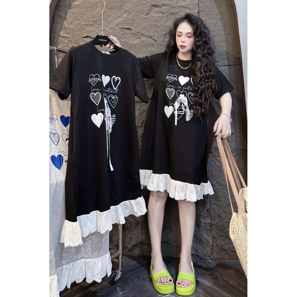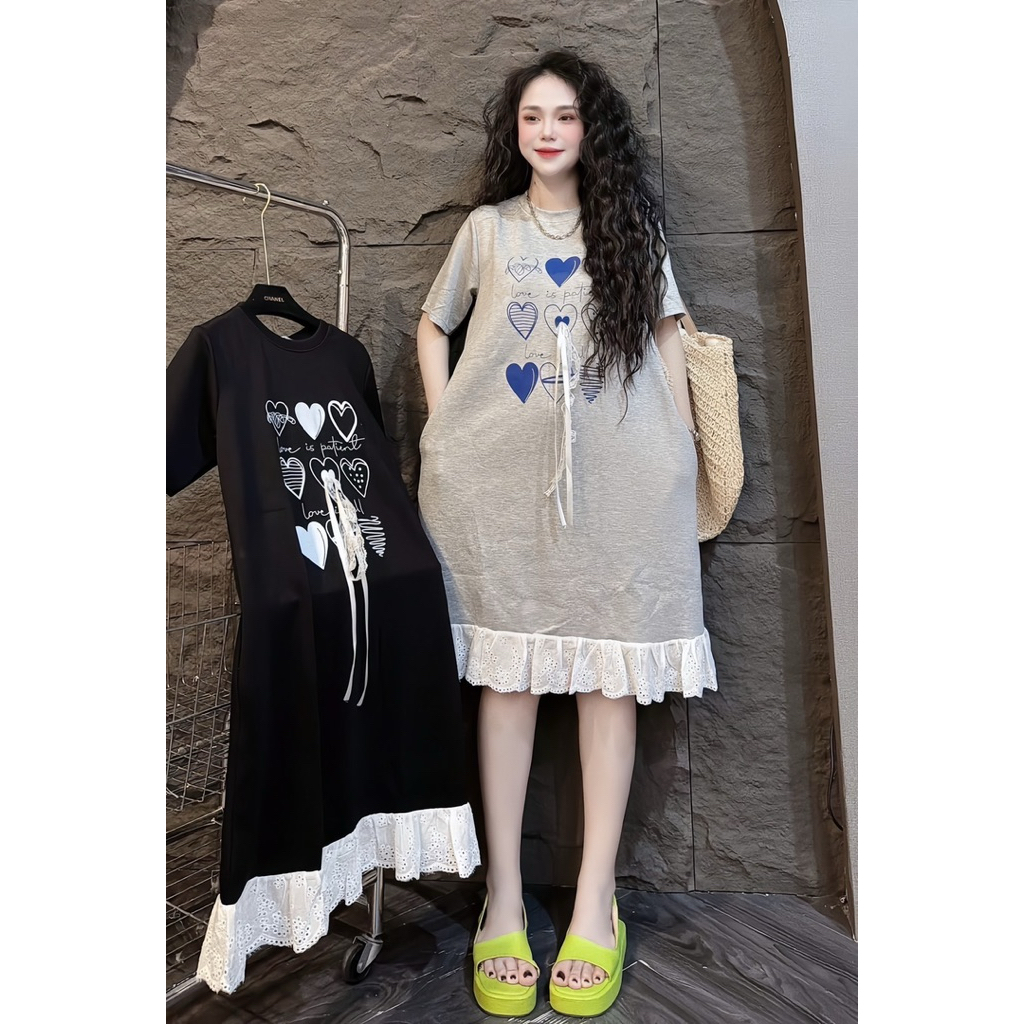 เดรสกระโปรงยาวระบายลูกไม้ งานพลัสไซร์ S m l xl 2xlใส่ได้ งานสวยดีไซน์เก๋ พิมพ์ลายหัวใจ เนื้อผ้าเย็นใส่สบายเนื้อคอตตอนเบาเย็นใส่สบายผ้าไม่ร้อน มี2สี ดำ เทา