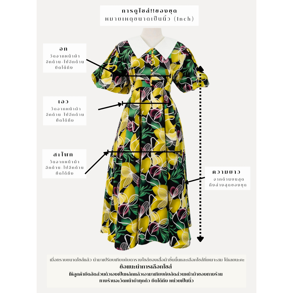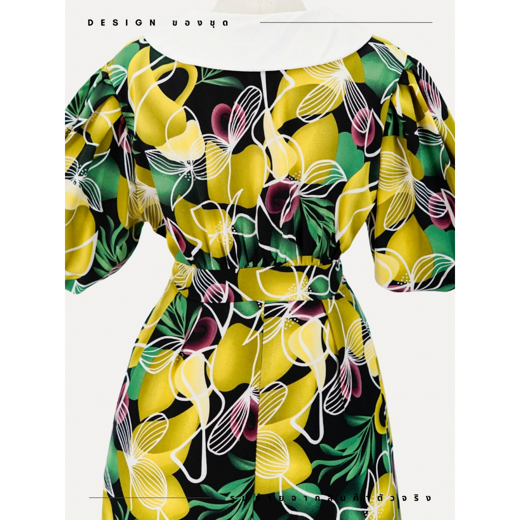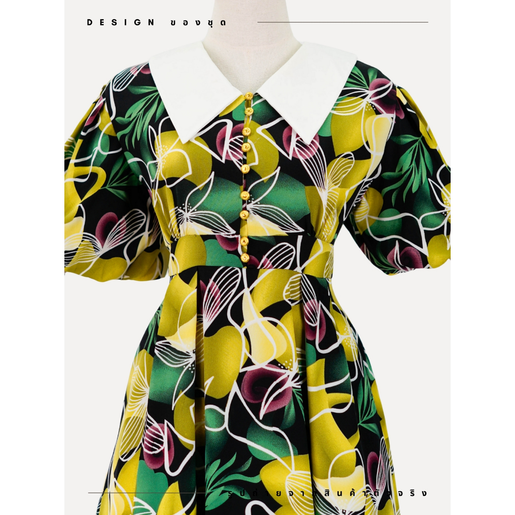 เดรสดอกไม้ แขนตุ๊กตา ลายดอก โทนเหลือง-เขียว ผ้าโพลีเอสเตอร์