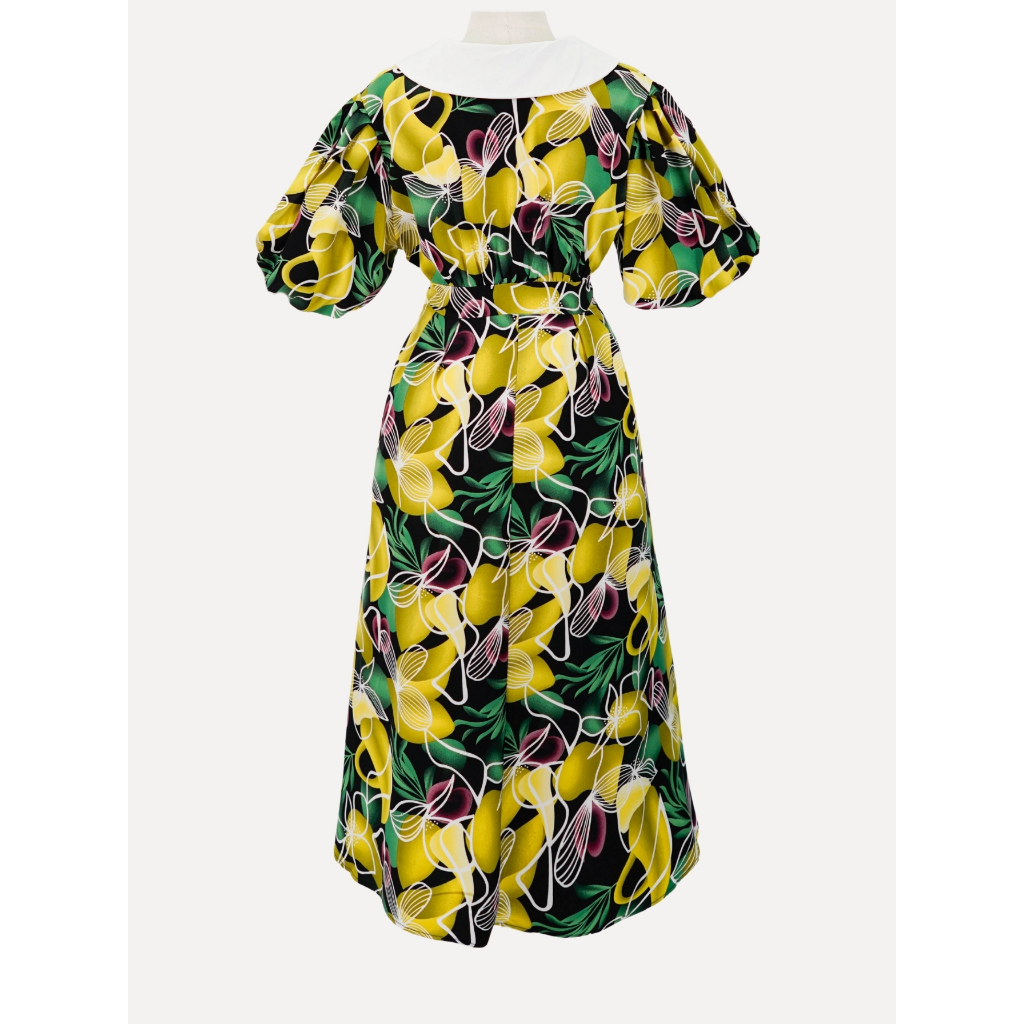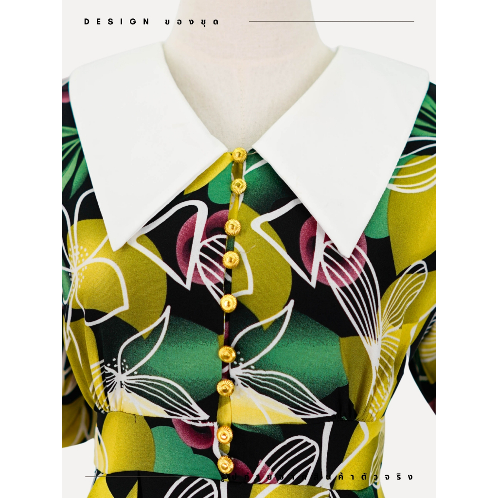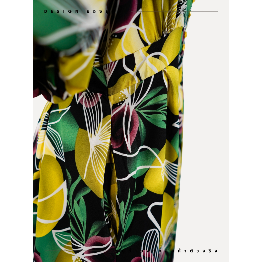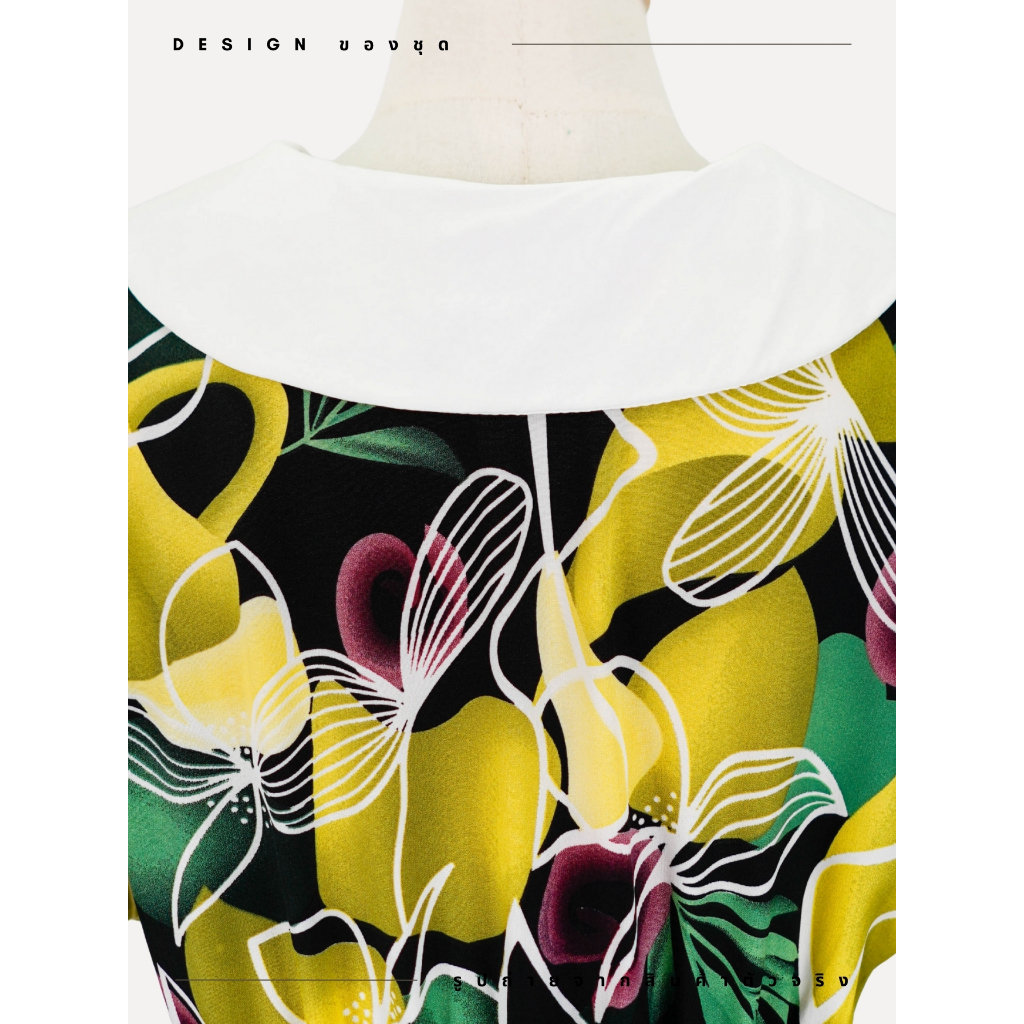 เดรสดอกไม้ แขนตุ๊กตา ลายดอก โทนเหลือง-เขียว ผ้าโพลีเอสเตอร์
