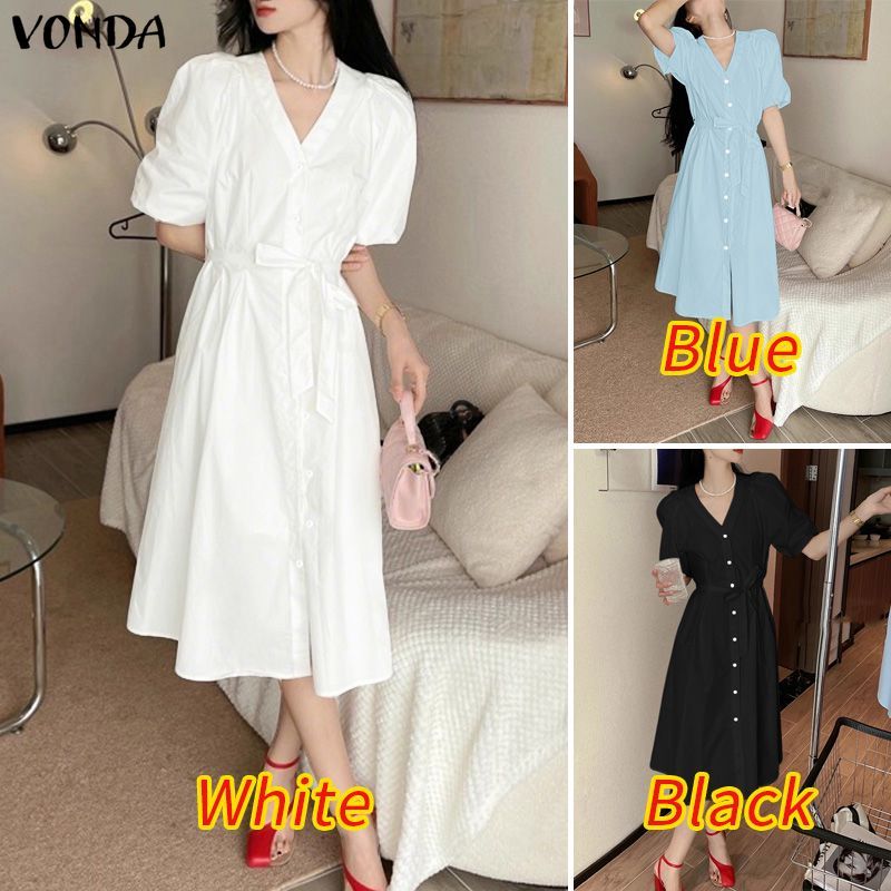 VONDA ผู้หญิงเกาหลีคอวีแขนพัฟปุ่ม Knot ฤดูใบไม้ผลิ/ฤดูร้อน
