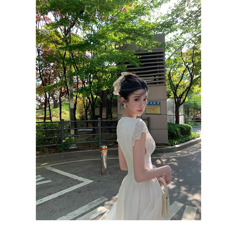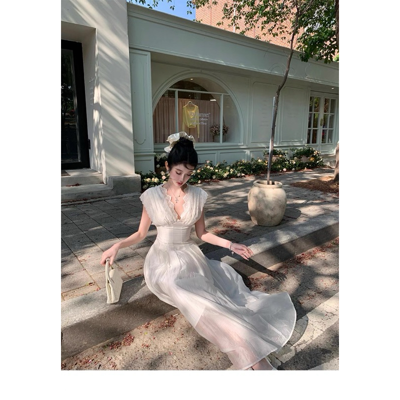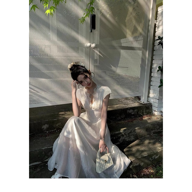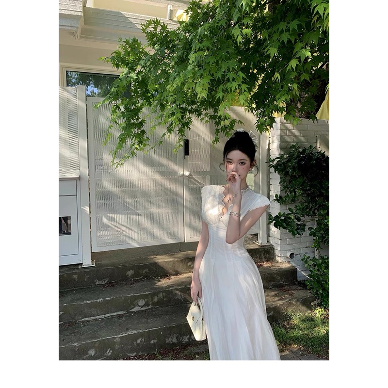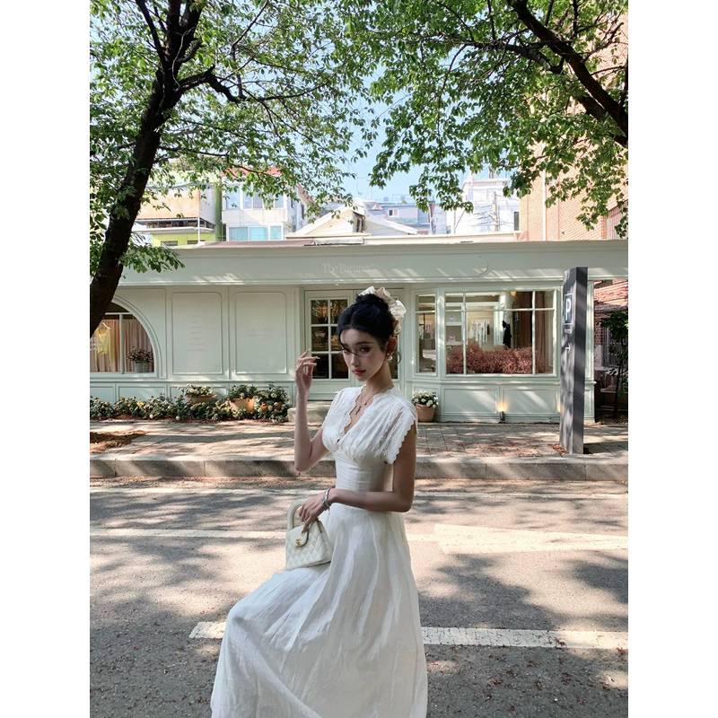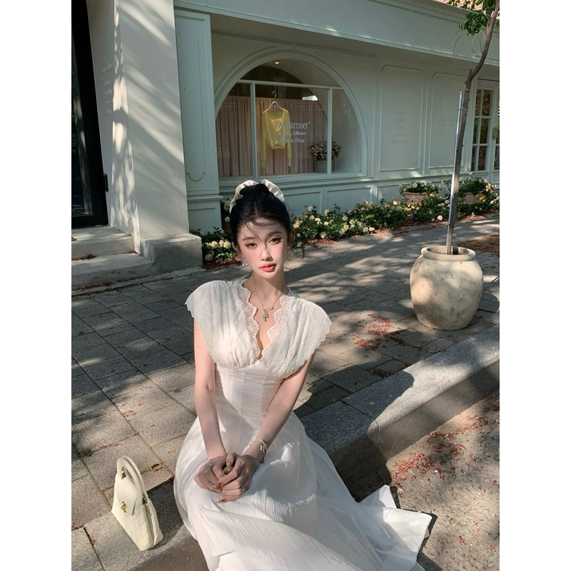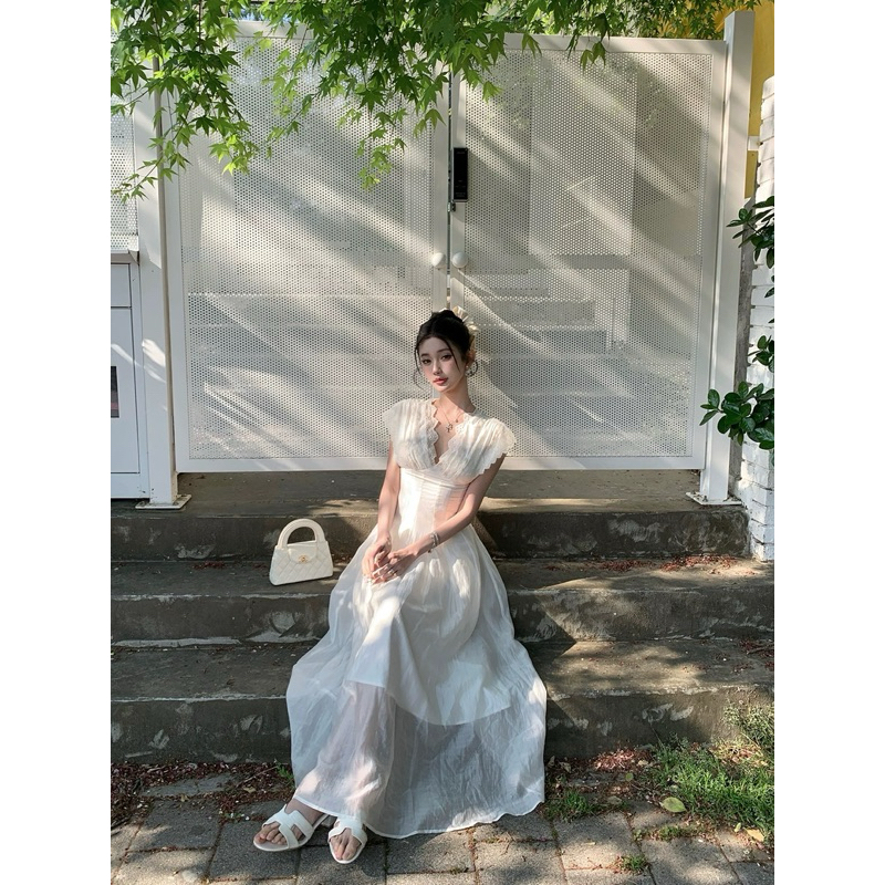 TIBU ชุดเดรสแม็กซี่คอวีปักลายดอกไม้ชุดเลดี้ยาวหรูหราสําหรับไปเที่ยวทะเลและปาร์ตี้ D452