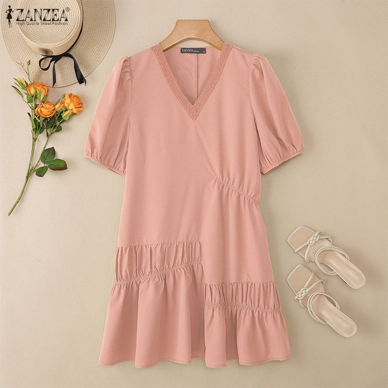 ชุดเดรสแขนสั้น แบบคอวีสไตล์เกาหลีสำหรับสตรี