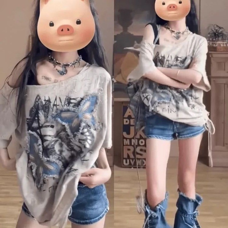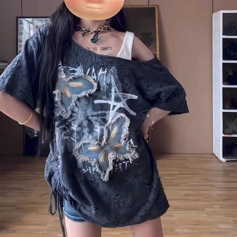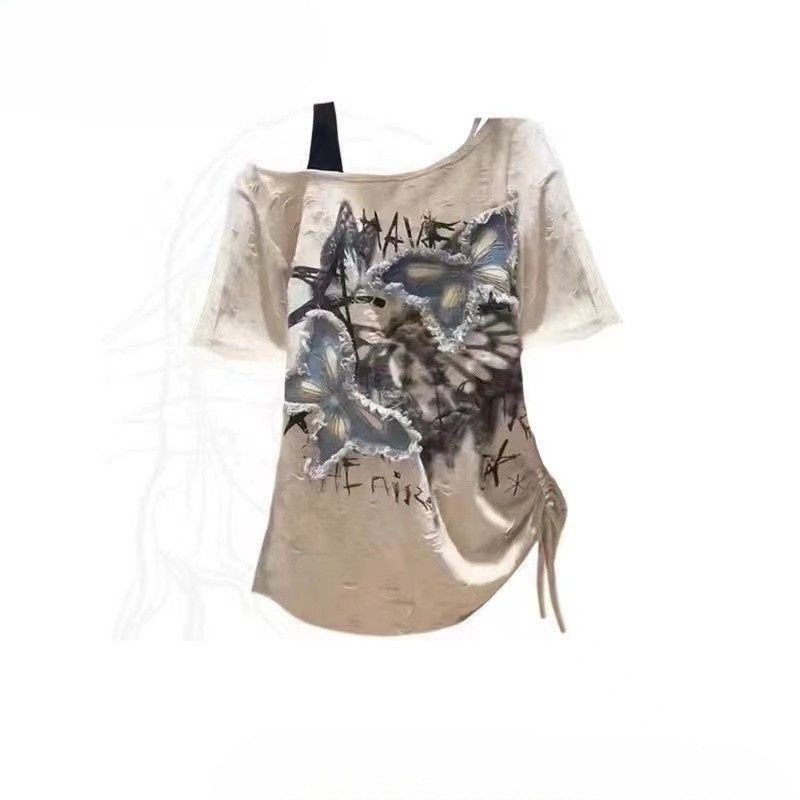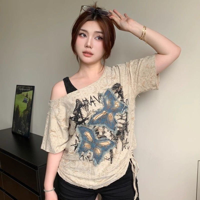 เสื้อยืดผู้หญิงสไตล์อเมริกันย้อนยุค ปิดไหล่ แขนสั้น สวมใส่ง่ายในฤดูร้อน
