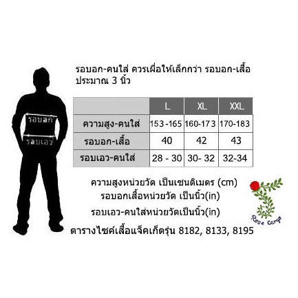 L : รอบอกเสื้อ 40" แขน 22.5" ความยาวเสื้อ 26"