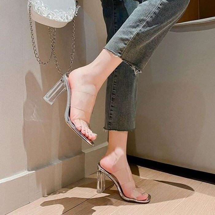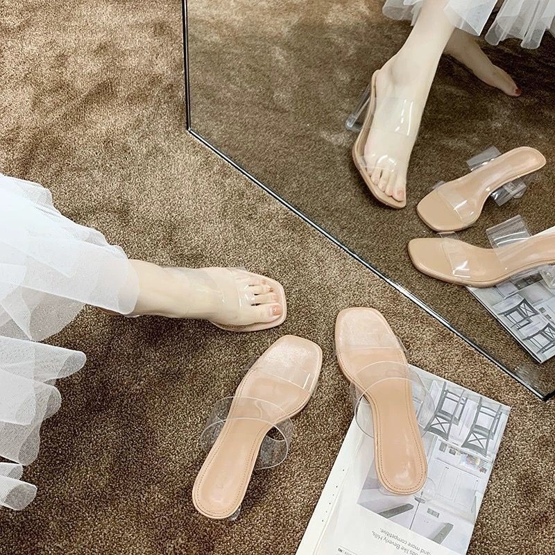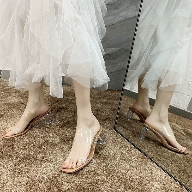 รองเท้าแตะส้นกลางสำหรับผู้หญิง แบบโปร่งใส มีคริสตัล และส้นหนา ดีไซน์ใหม่ เหมาะสำหรับฤดูร้อน
