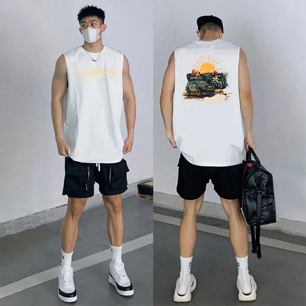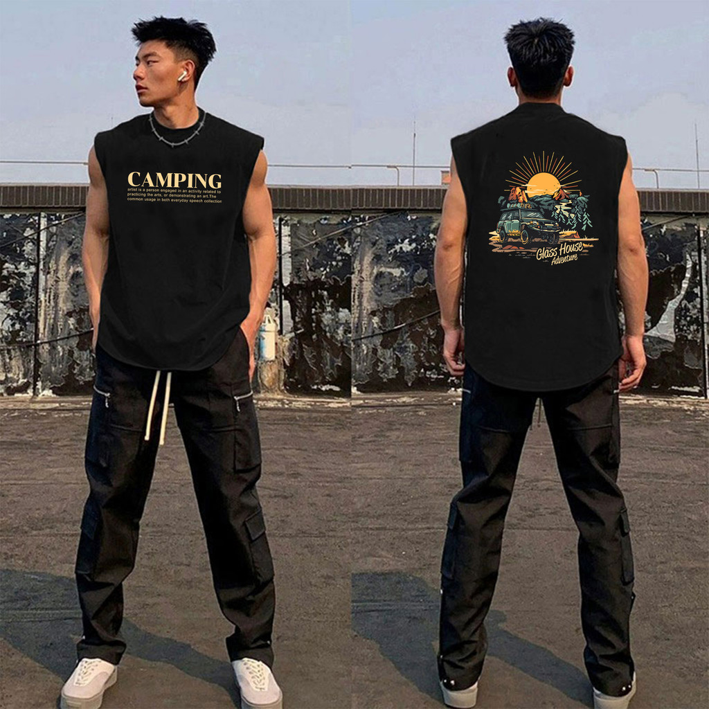 UT shop เสื้อยืด แขนกุด เสื้อกล้าม oversize ผ้าCotton100%วินเทจ เสื้อยืดคอกลมแขนกุด เสื้อผู้ชาย’CAMPING’แขนสั้น 2025