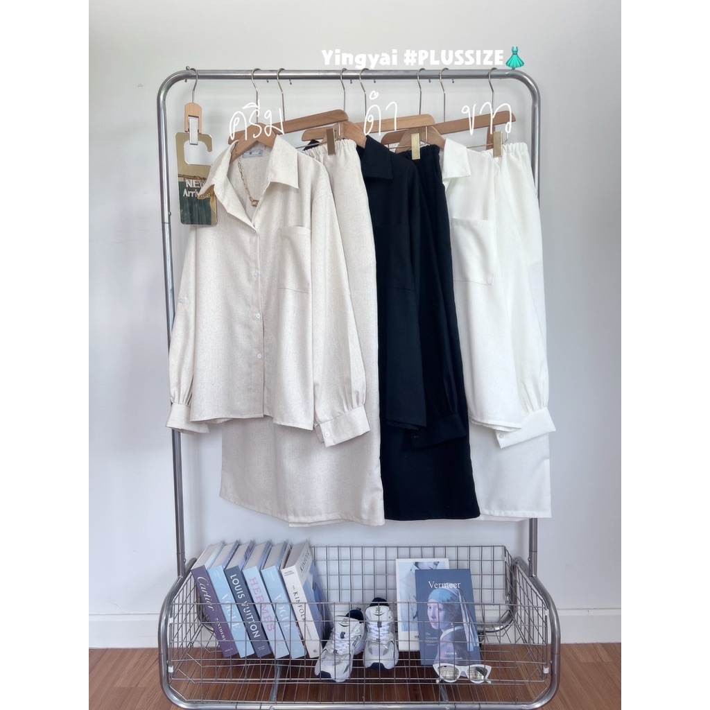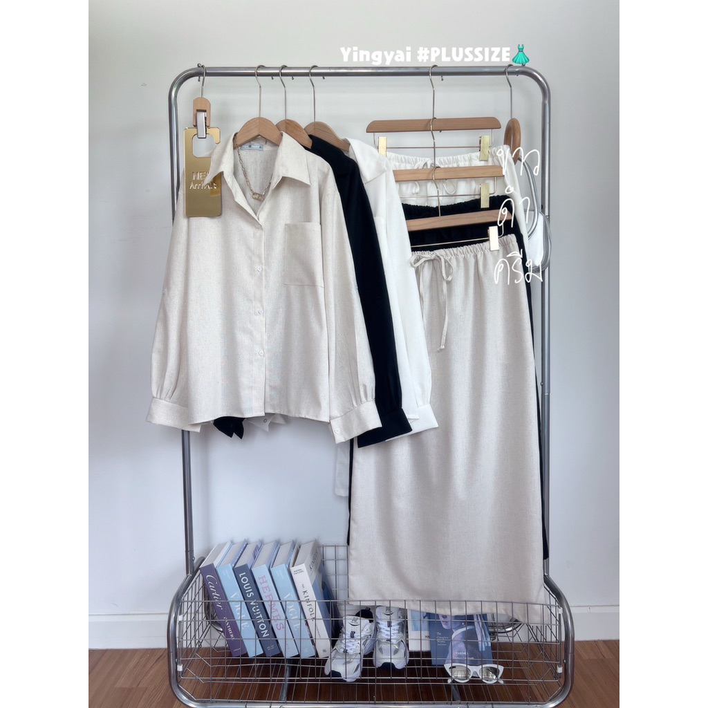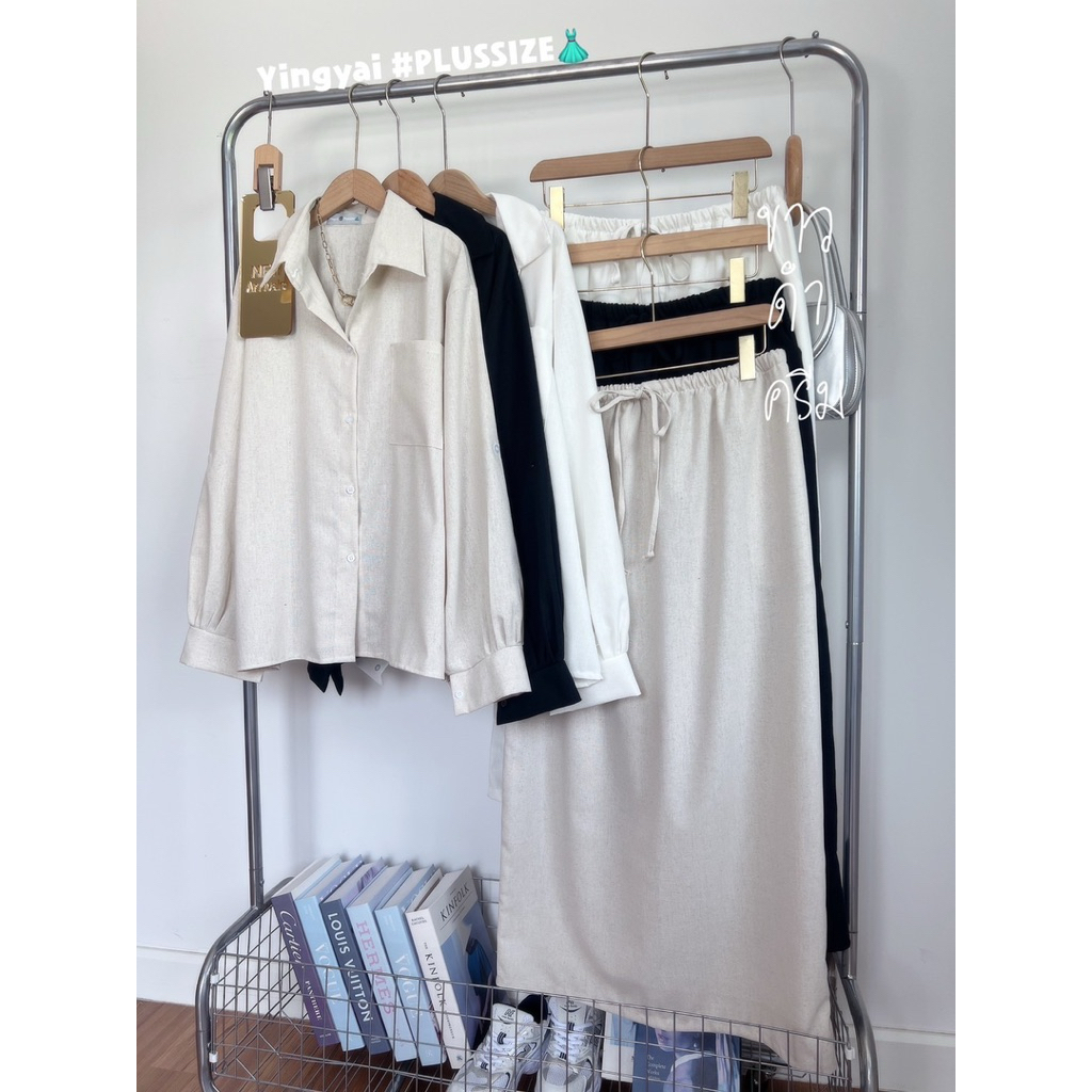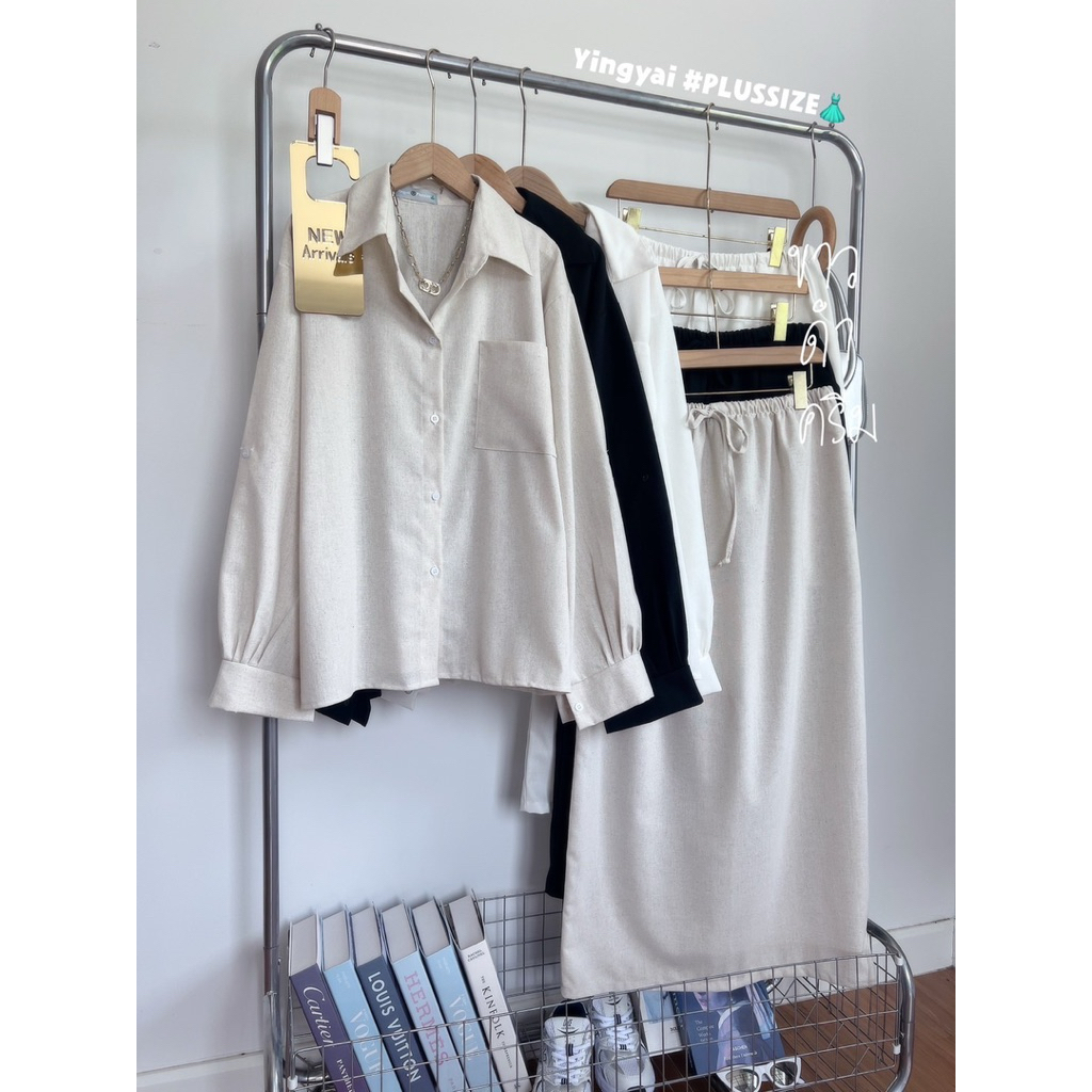 ชุดเซ็ท 2 ชิ้น เสื้อเชิ้ตแขนยาวoversize กระเป๋าหน้า แมชกระโปรงยาว เอวสม็อครอบ ไซส์ใหญ่ สาวอวบ