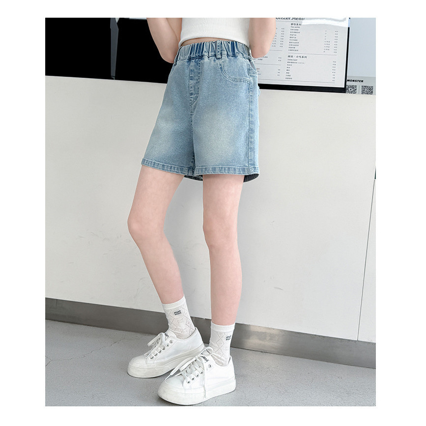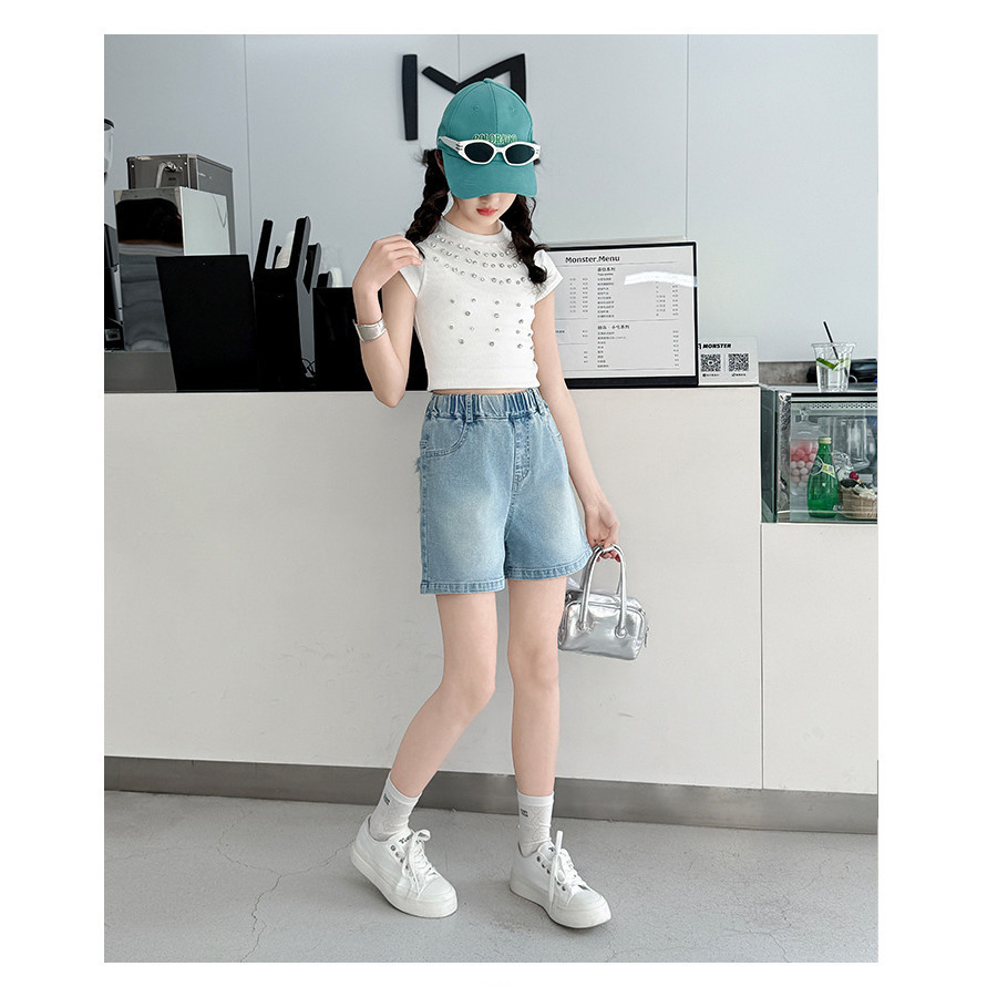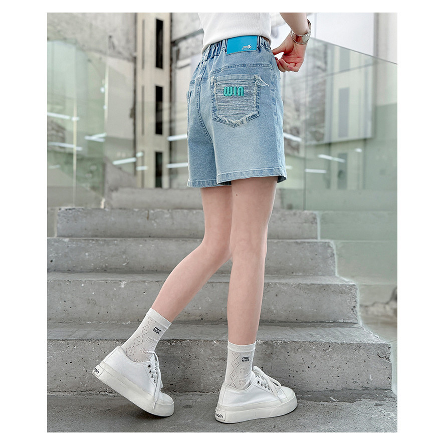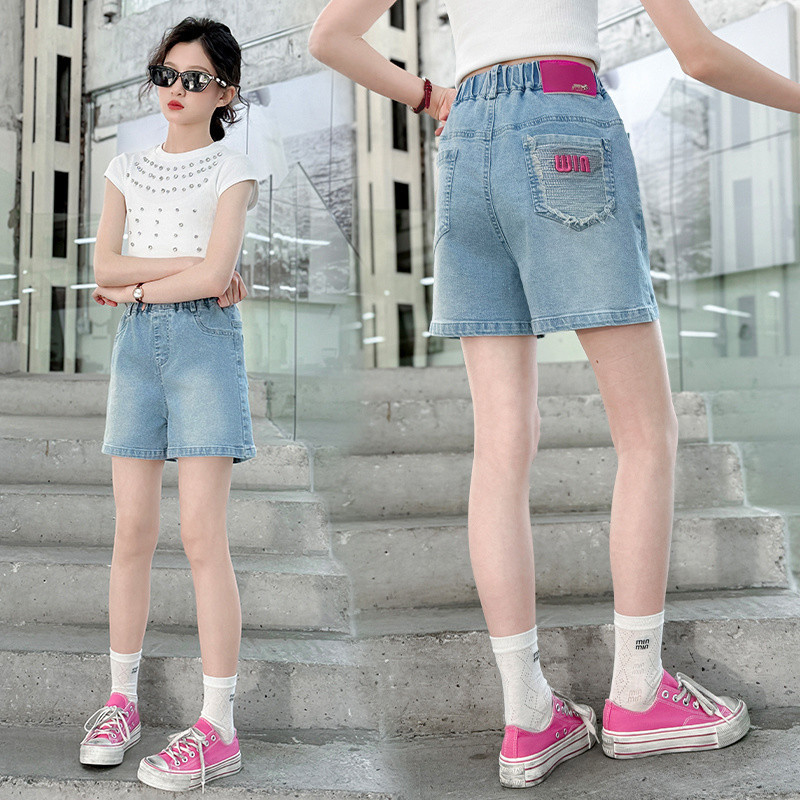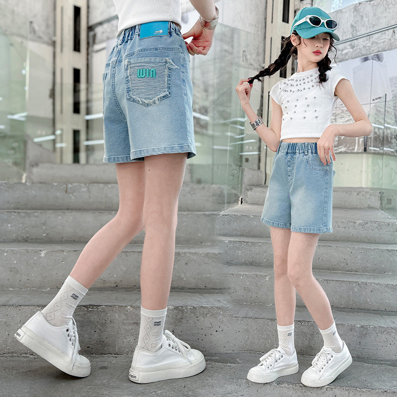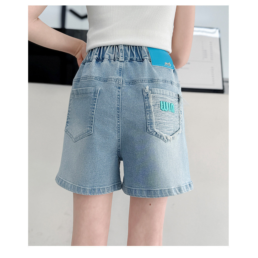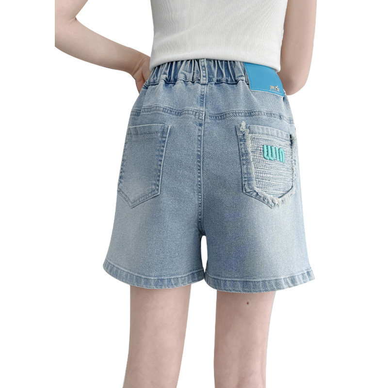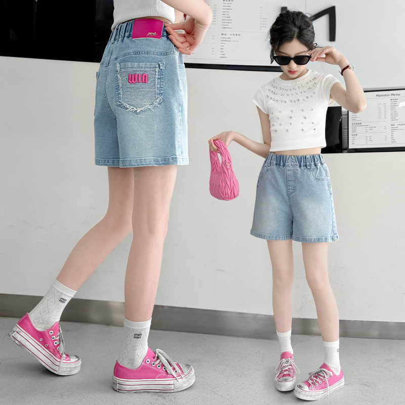 กางเกงขาสั้นผ้ายีนส์เด็กผู้หญิง2025ฤดูร้อนแบบบางระบายอากาศปักลายกางเกงขาสั้นทรงหลวมสำหรับเด็กผู้หญิง