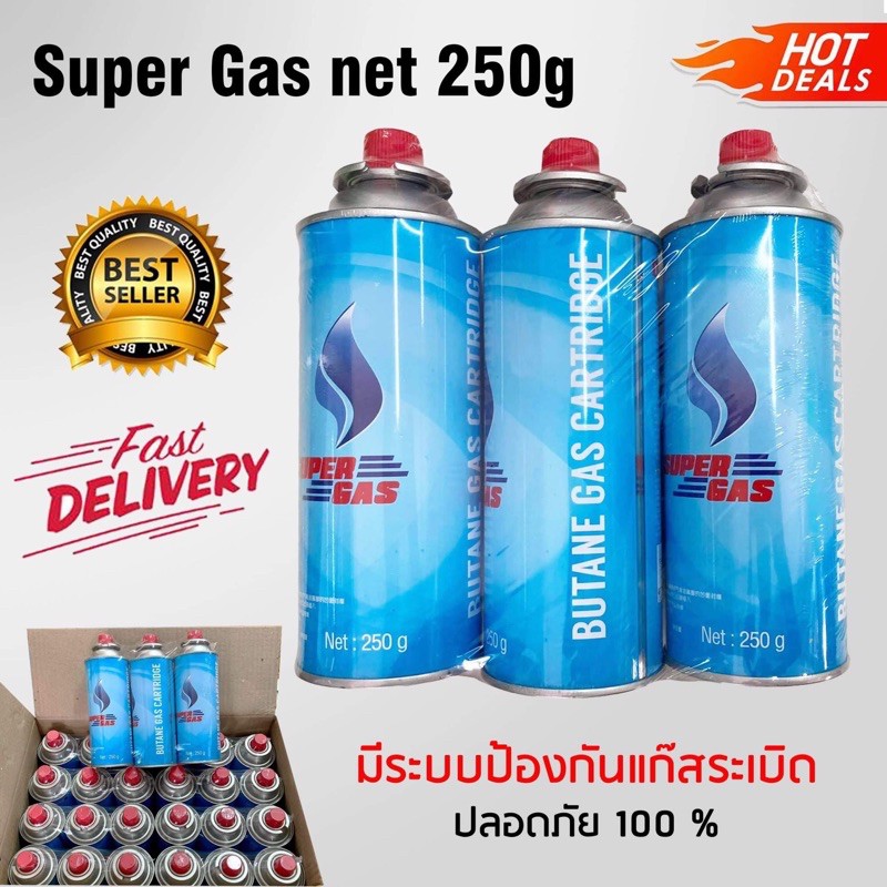 แก๊สกระป๋อง ยี่ห้อ Super Gas จำนวน 3 กระป๋อง/ ( 1 แพ็ค ) ความจุก๊าซ 250 g / กระป๋อง