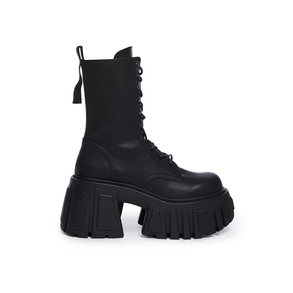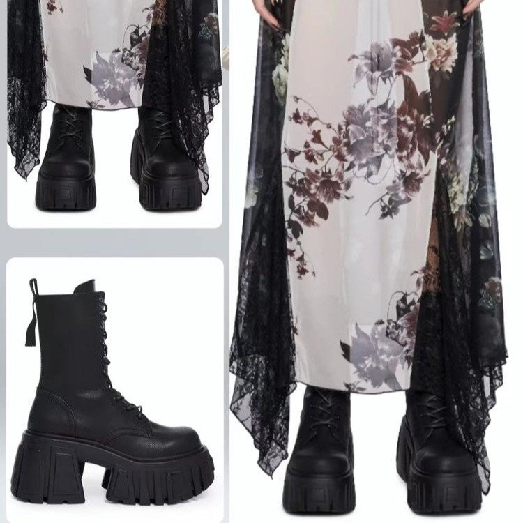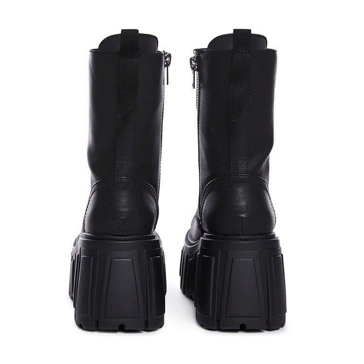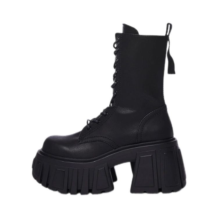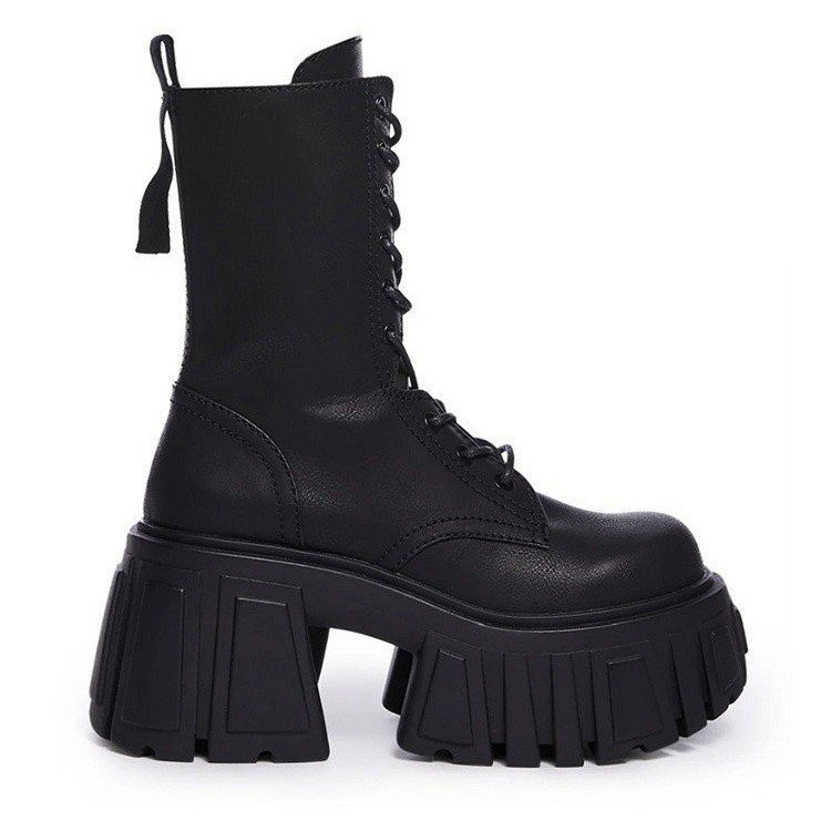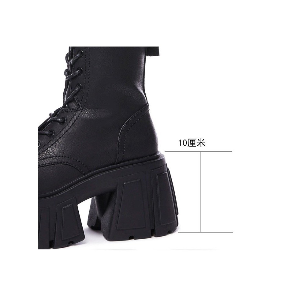 10 ซม.หนา Soled สไตล์อังกฤษสีดํา Mid-Tube ด้านหน้า Lace-Up Martin Boots PU แฟชั่นสบายๆกลางแจ้งสวมใส่ Anti-Slip ทนต่อการสึกหรอ Travel ช้อปปิ้งคอนเสิร์ตการ์ตูนนิทรรศการแฟชั่น Bo