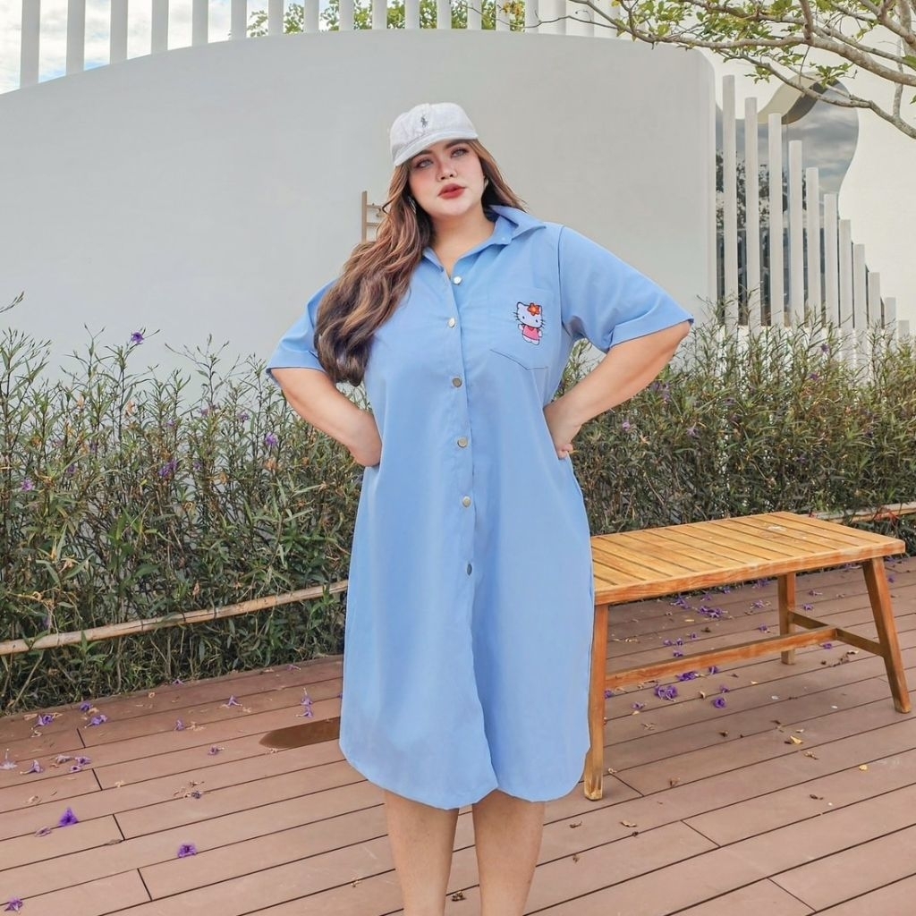 เดรสเชิ้ตปักคิตตี้ อก40-62นิ้ว ผ้ายีนส์บาง มีกระเป๋า คอปก แขนสั้น กระดุมใช้ได้จริง สาวอวบ ไซส์ใหญ่ MG27-0
