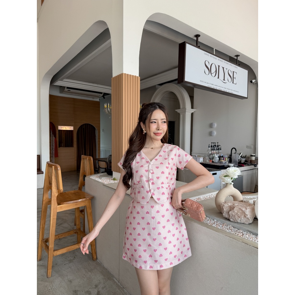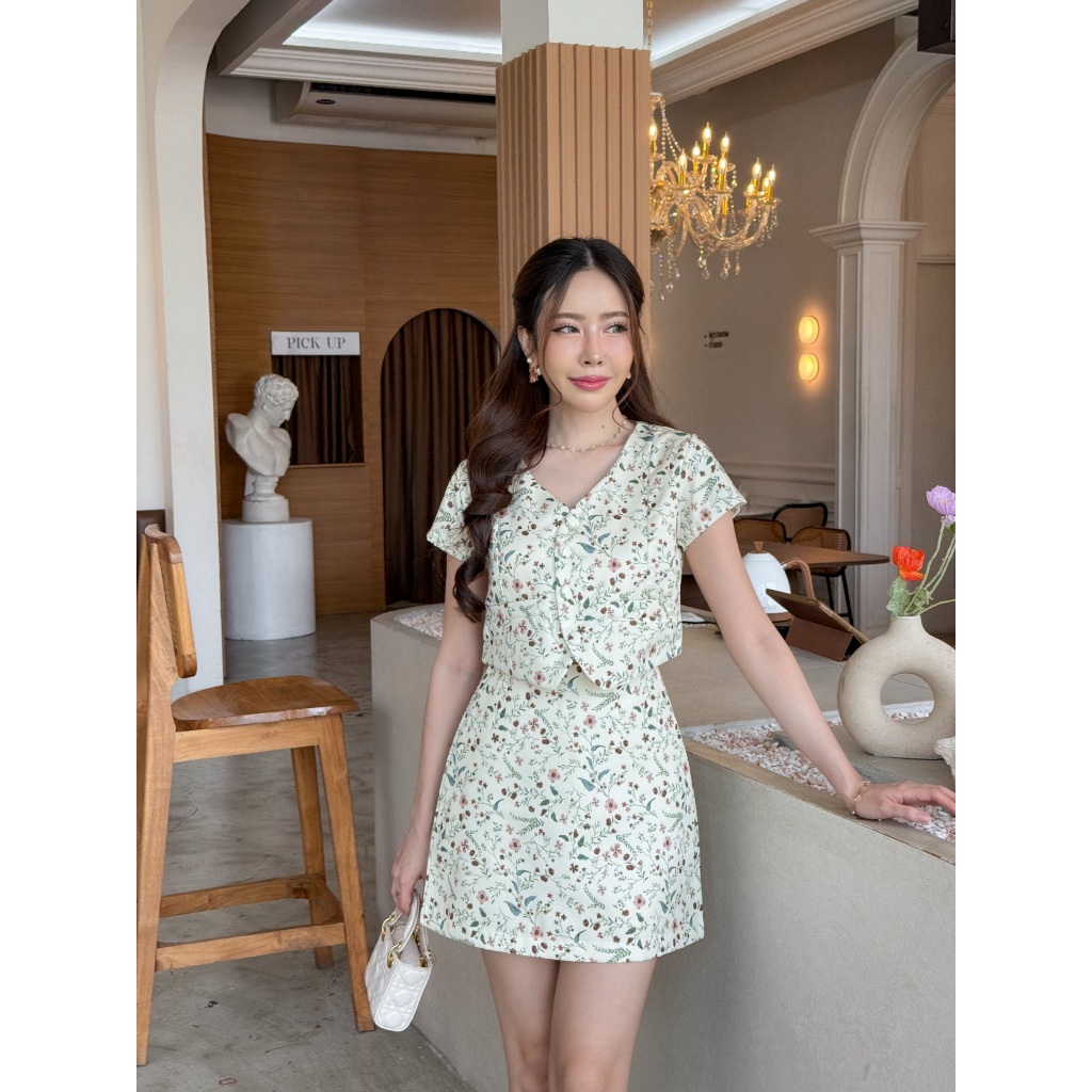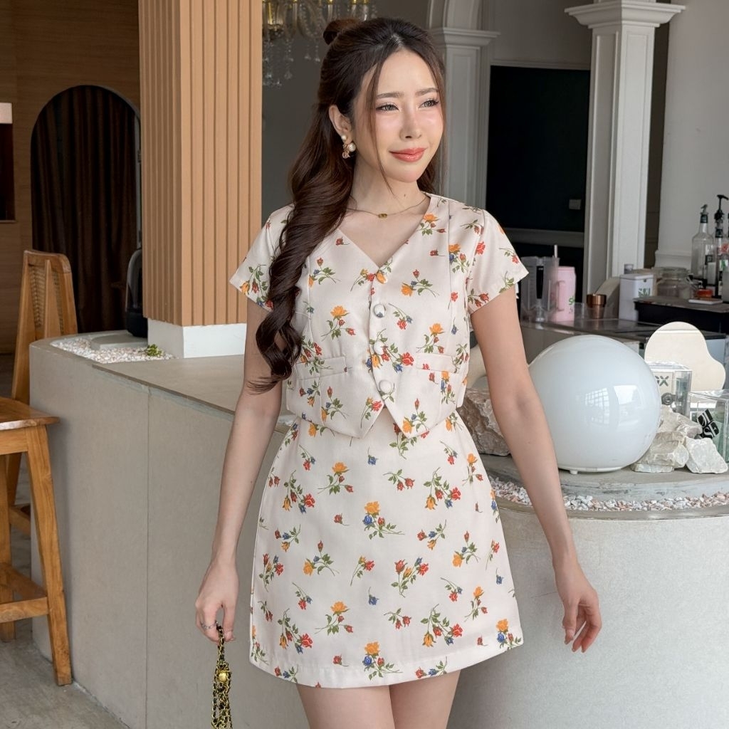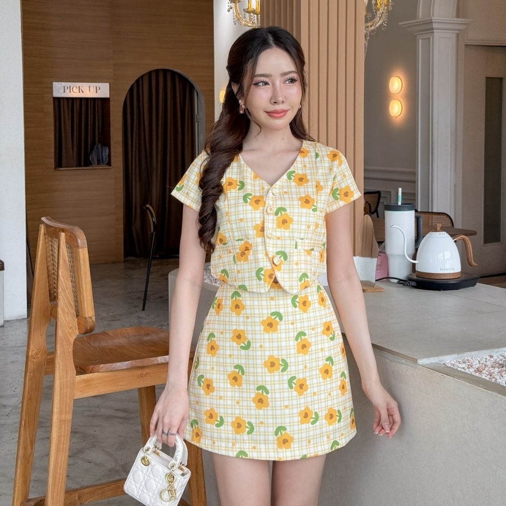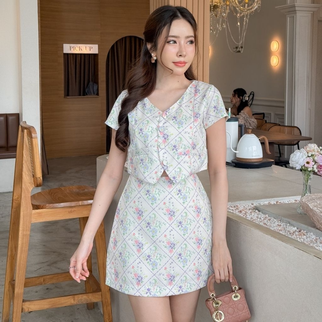 V3(S-3XL) ชุดเซ็ทเสื้อและกระโปรงสั้นลายดอกน่ารัก