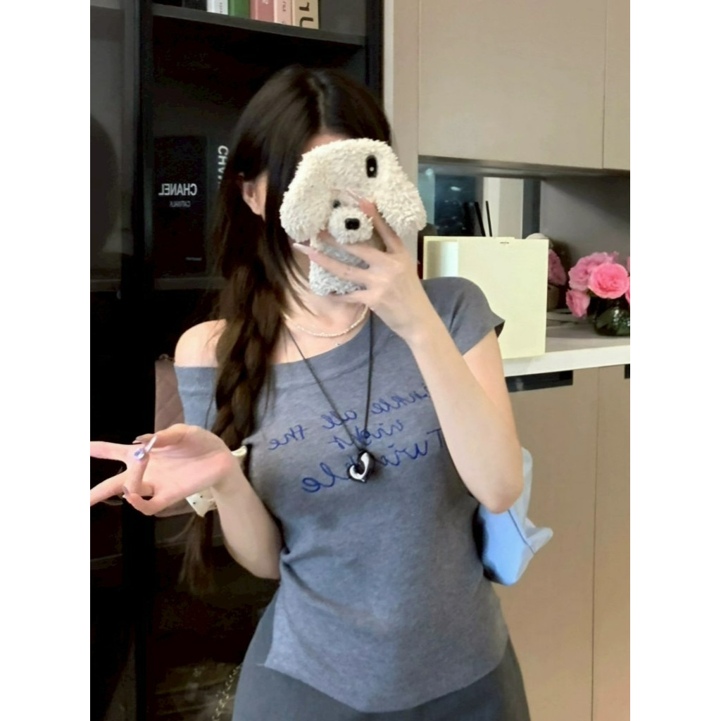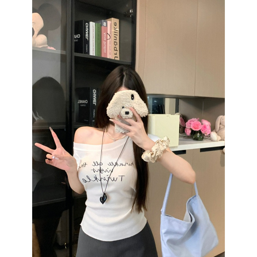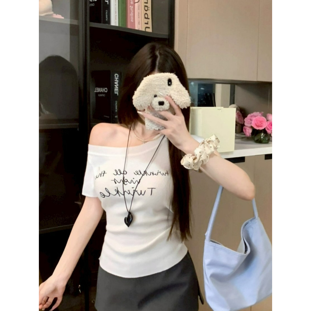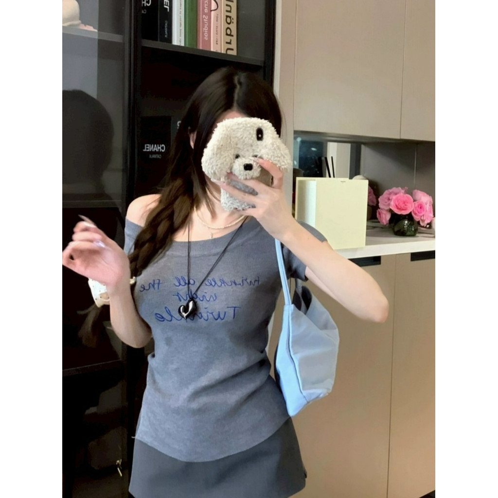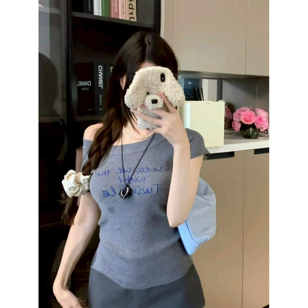 ?Evelyn?เสื้อไหมพรม แขนสั้น เปิดไหล่ สีพื้น เข้ารูป เสื้อยืด ยืดพอดีตัว สไตล์เกาหลี แฟชั่น