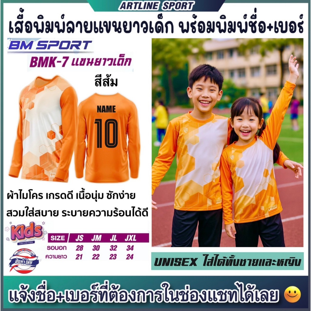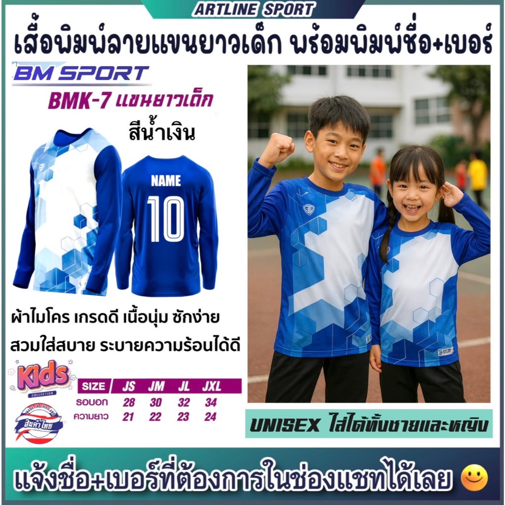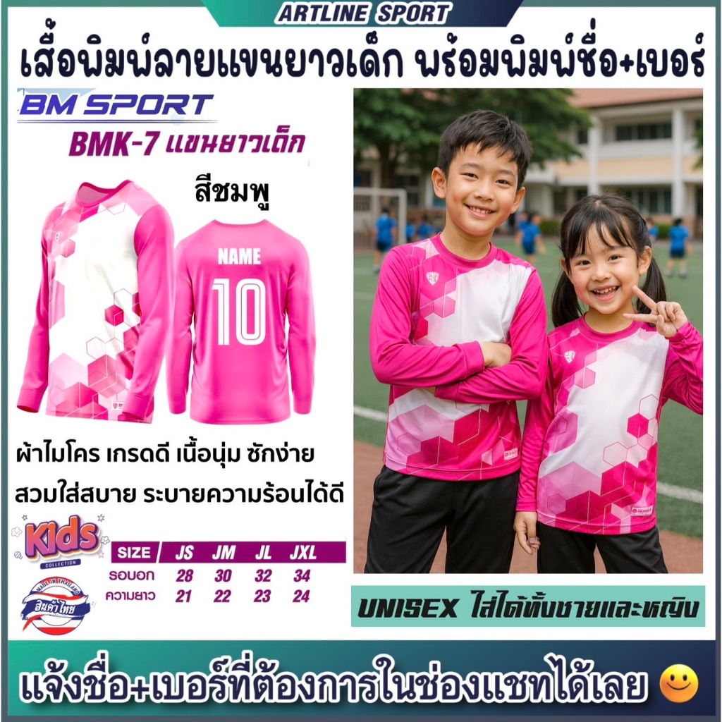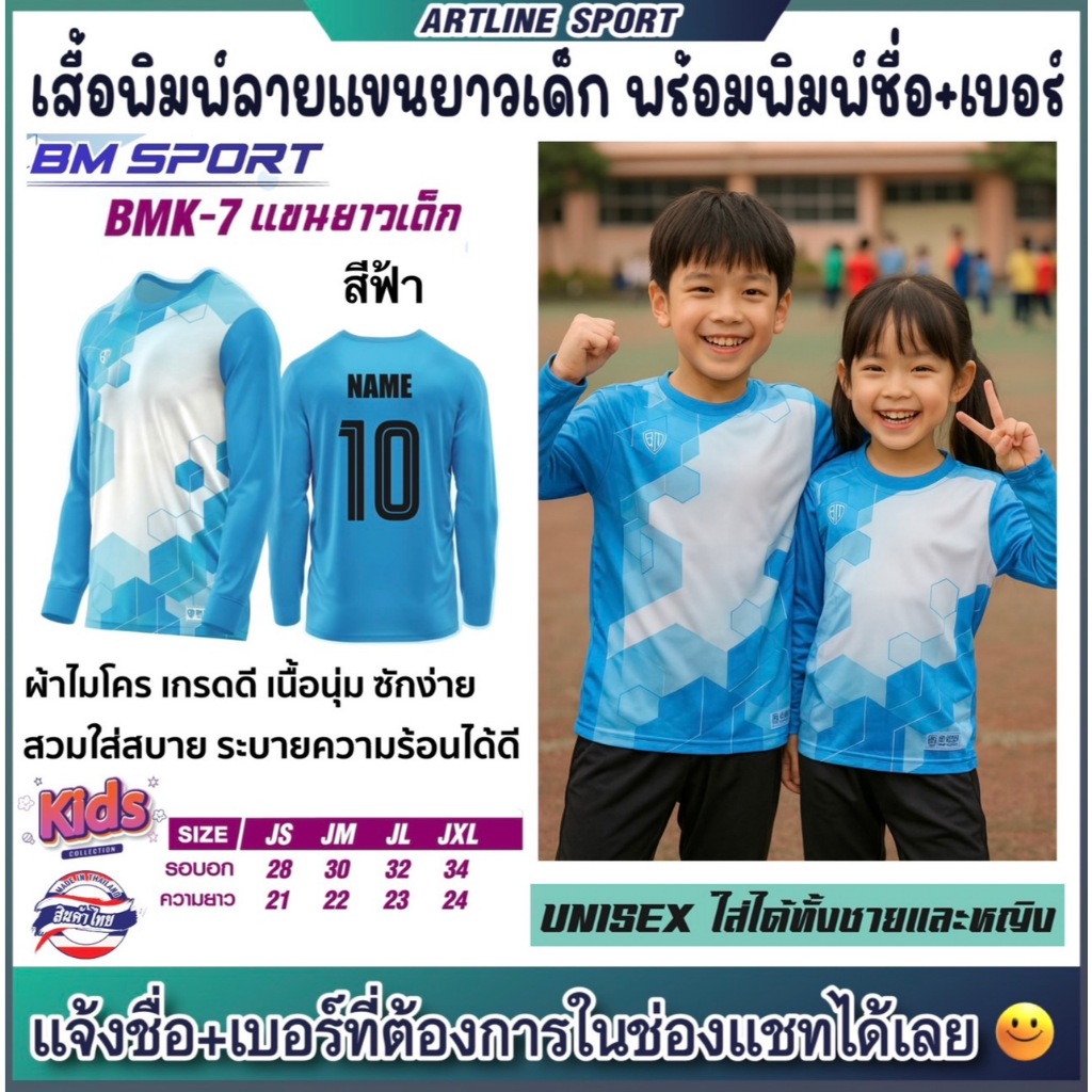 BM SPORT เสื้อพิมพ์ลายแขนยาวของเด็ก พร้อมพิมพ์ชื่อ + เบอร์ รุ่น BMK-7 เนื้อนุ่ม คุณภาพดี ใส่สบาย แบรนด์ BM SPORT แท้ (สินค้าไทย)