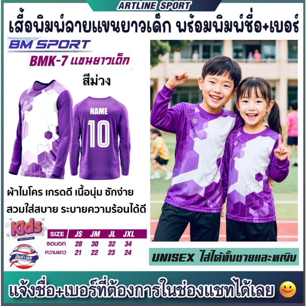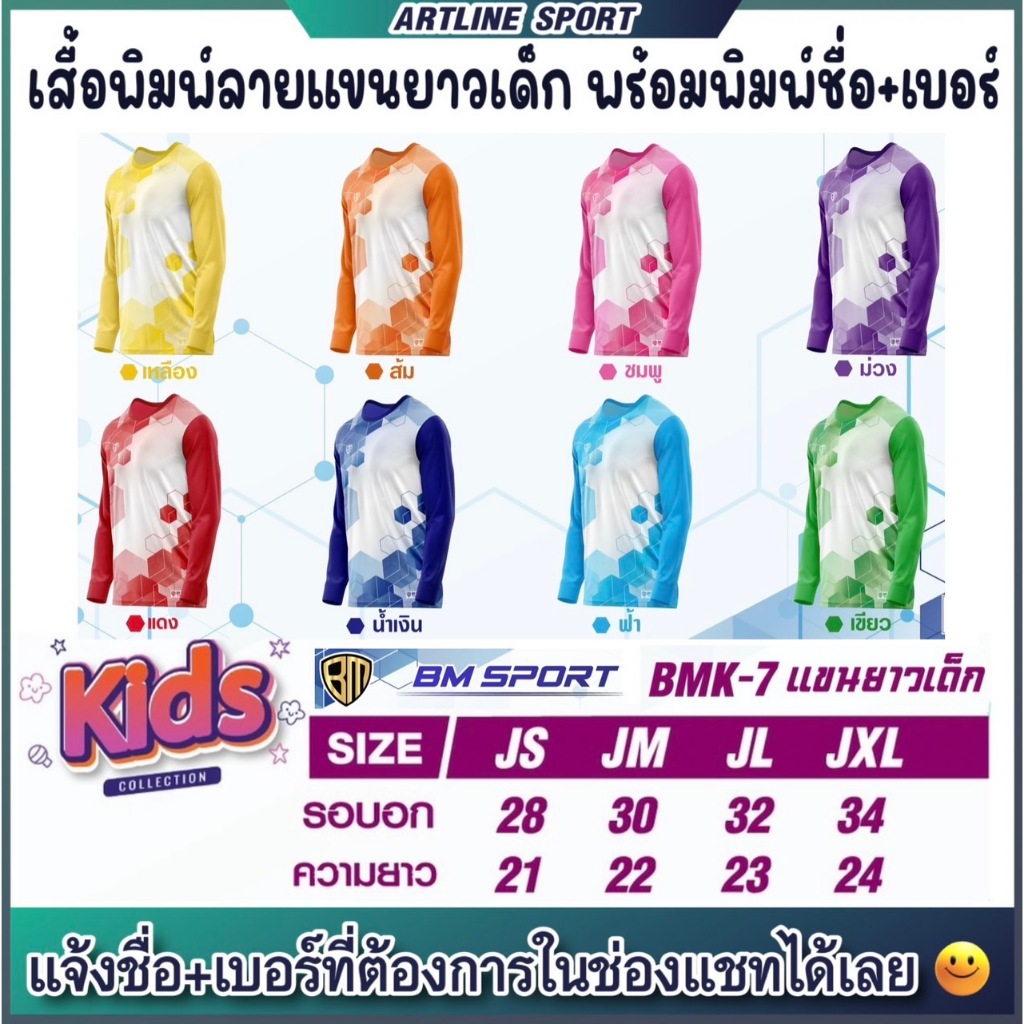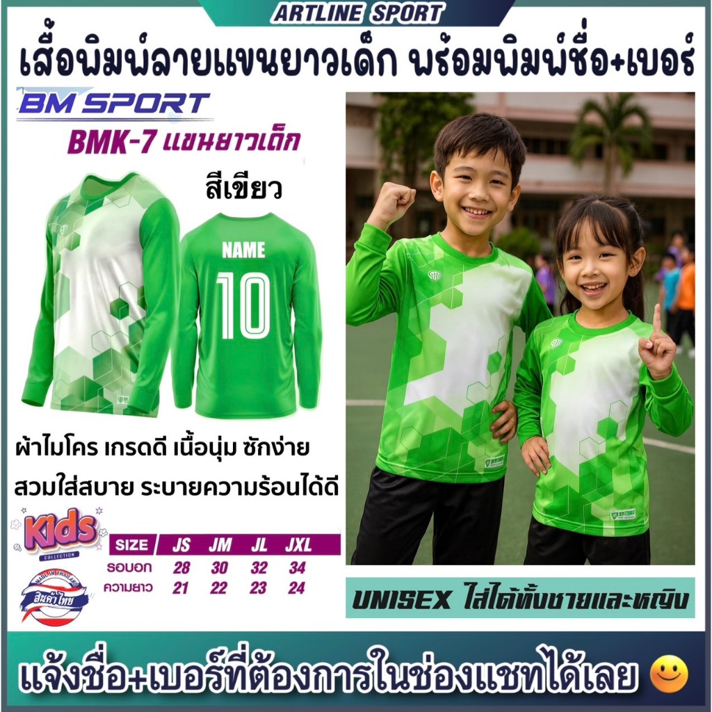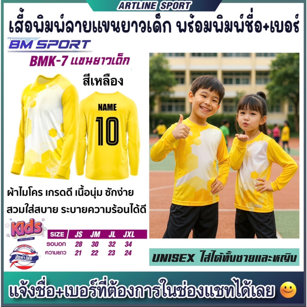 BM SPORT เสื้อพิมพ์ลายแขนยาวของเด็ก พร้อมพิมพ์ชื่อ + เบอร์ รุ่น BMK-7 เนื้อนุ่ม คุณภาพดี ใส่สบาย แบรนด์ BM SPORT แท้ (สินค้าไทย)