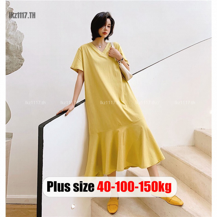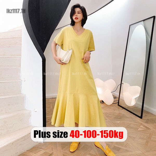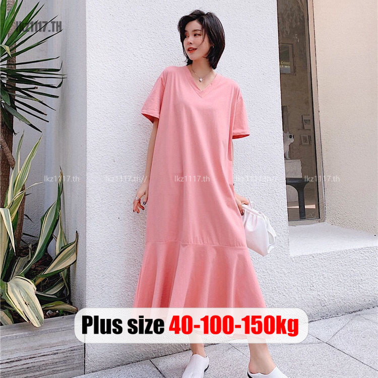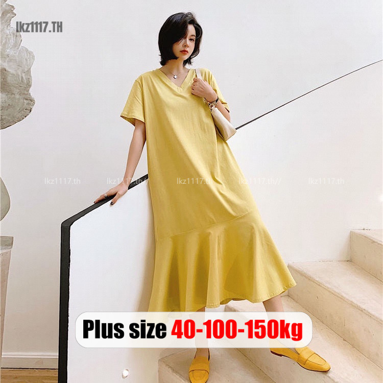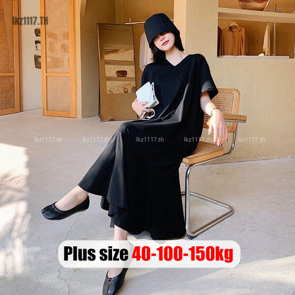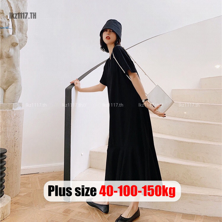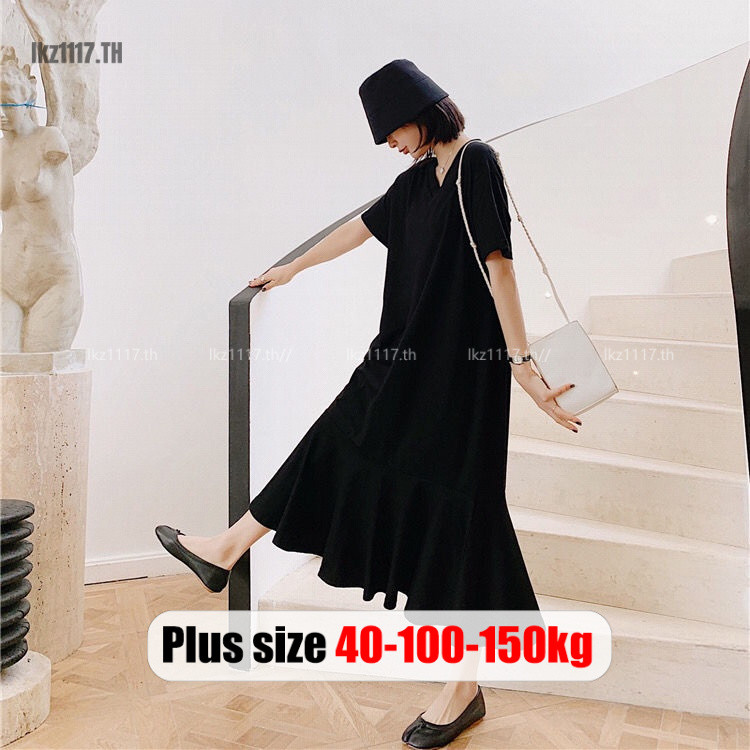 Plus Size✅เดรสสาวอวบ ไซส์ใหญ่ ผู้หญิง เดรสหางปลา สาวอวบ เดรสยาว แขนสั้น ทรงหลวม คอกลม สีดำ ฤดูร้อน เกาหลี แฟชั่น Oversize พลัสไซส์ สาว อวบอ้วน ใส่ได้