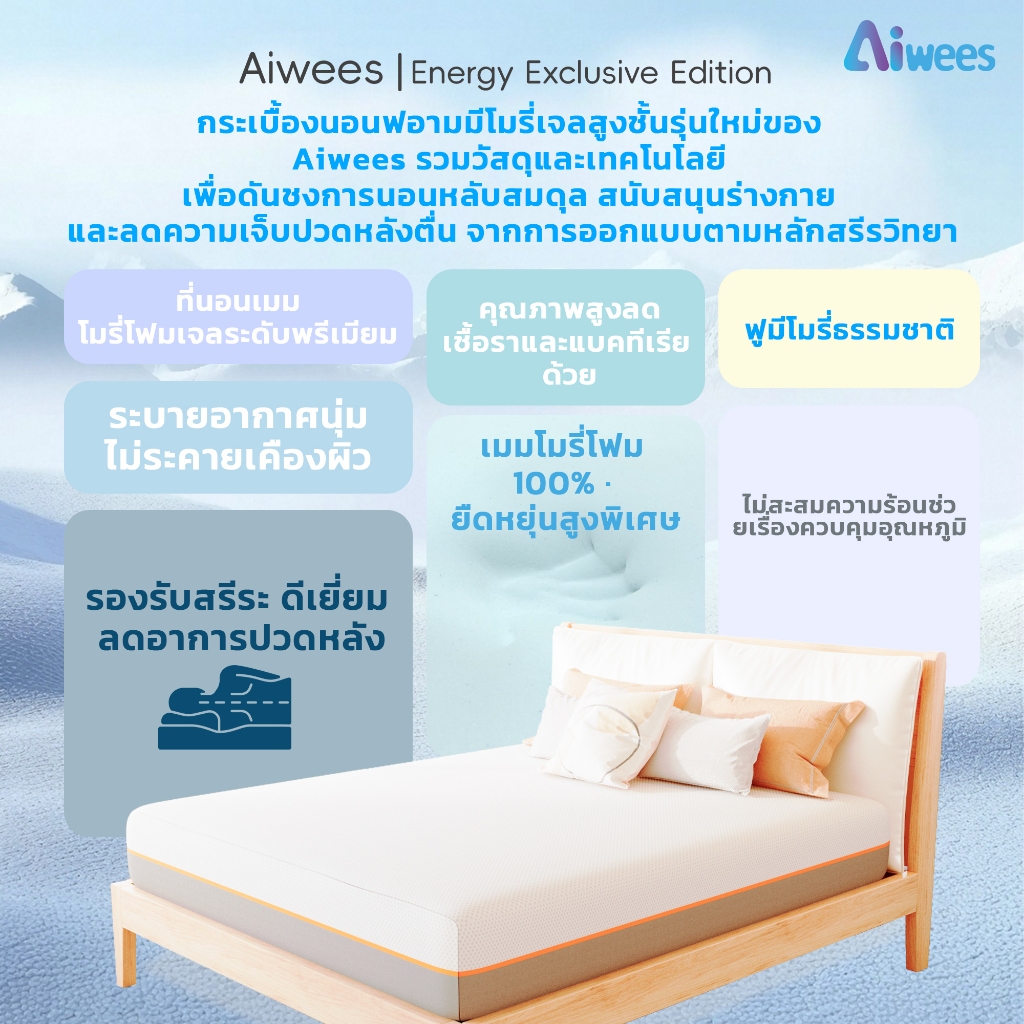 ❄ ที่นอนเมมโมรี่โฟมเจลเย็น Aiwees Sleep รุ่น Energy Exclusive Edition ดีไซน์มินิมอล วัสดุคุณภาพ เย็นสบาย ช่วยให้หลับสบายขึ้น รับประกัน 3 ปี