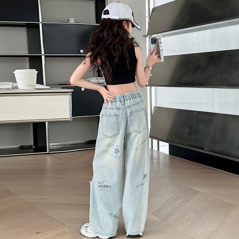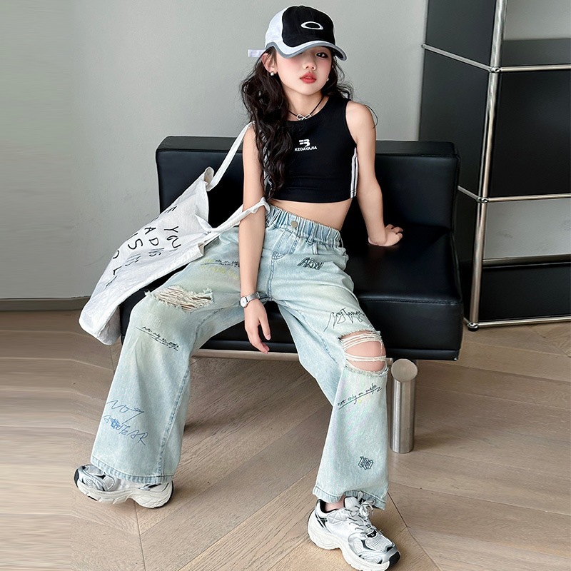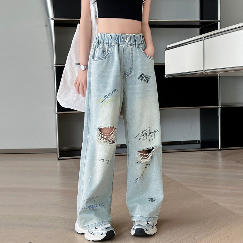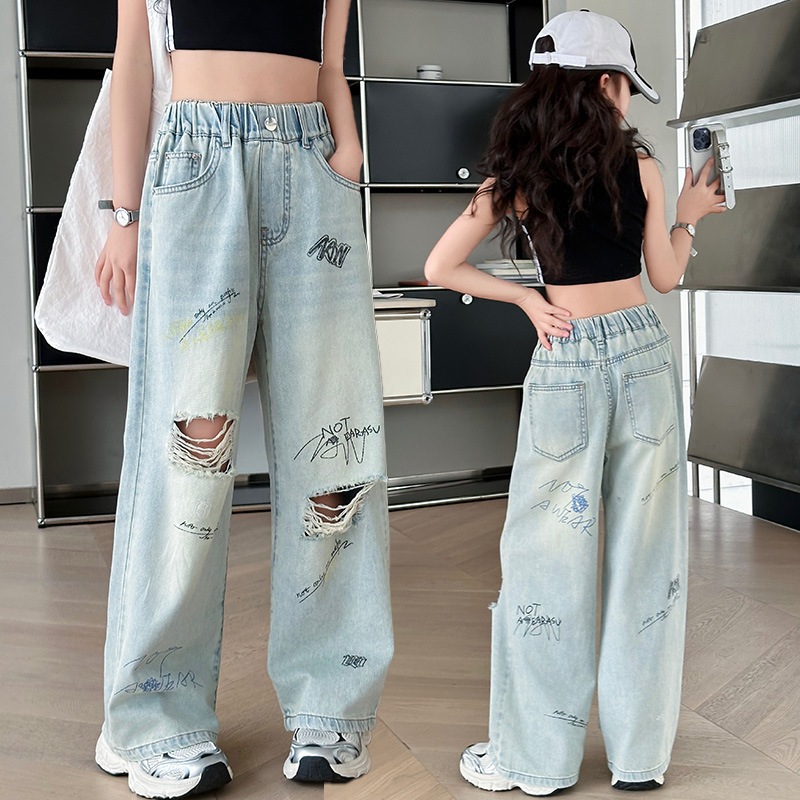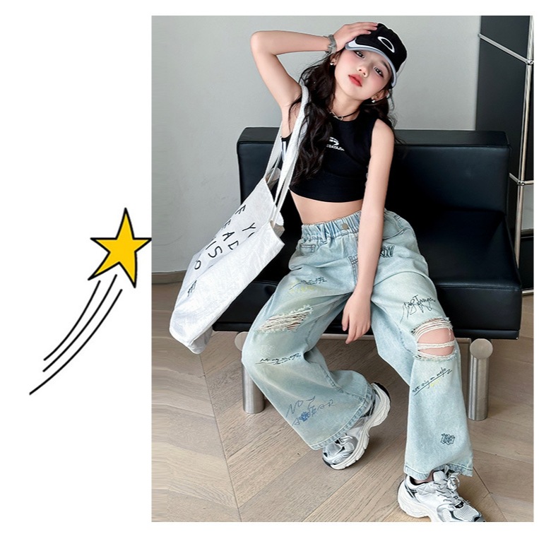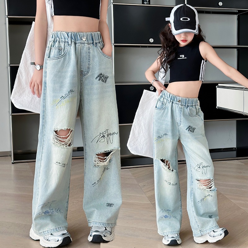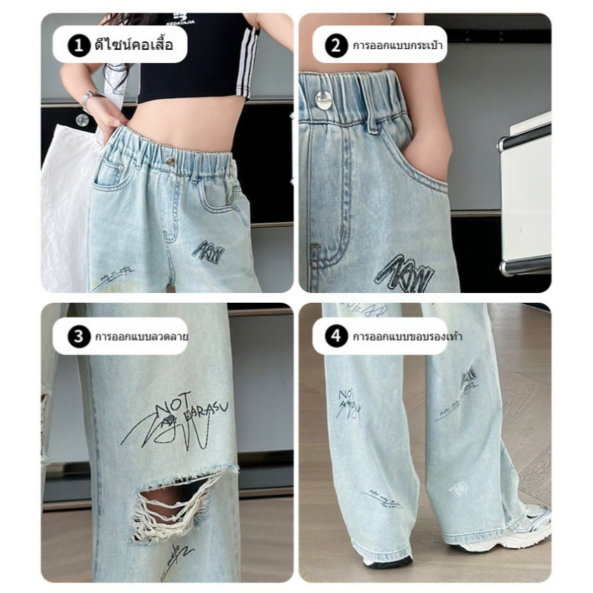 กางเกงยีนส์เด็กผู้หญิง กางเกงยีนส์ฉีก กางเกงเด็กผู้หญิง เอวยางยืด เทรนด์ แฟชั่น ฤดูร้อน รายวัน ระเบิด ถนน 7-14 ปี