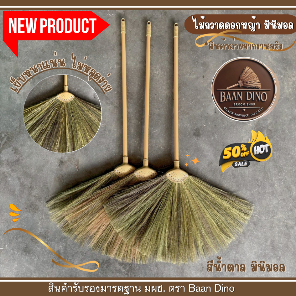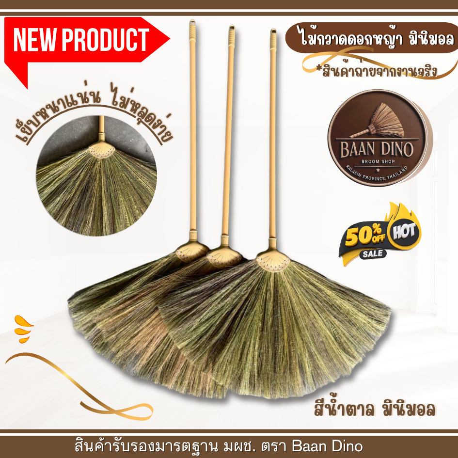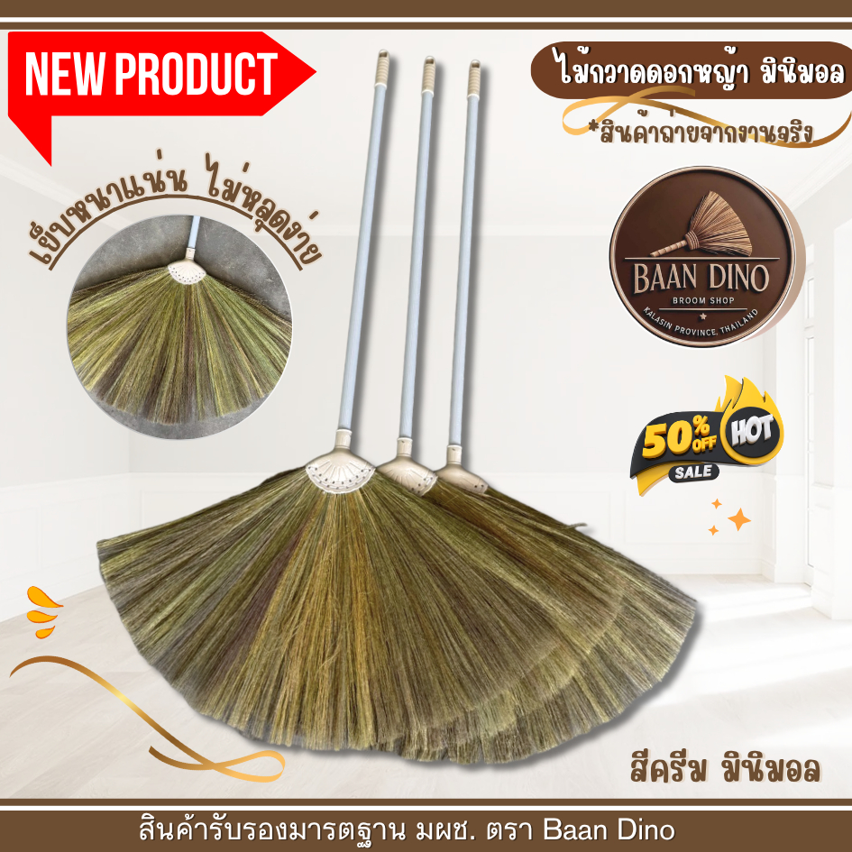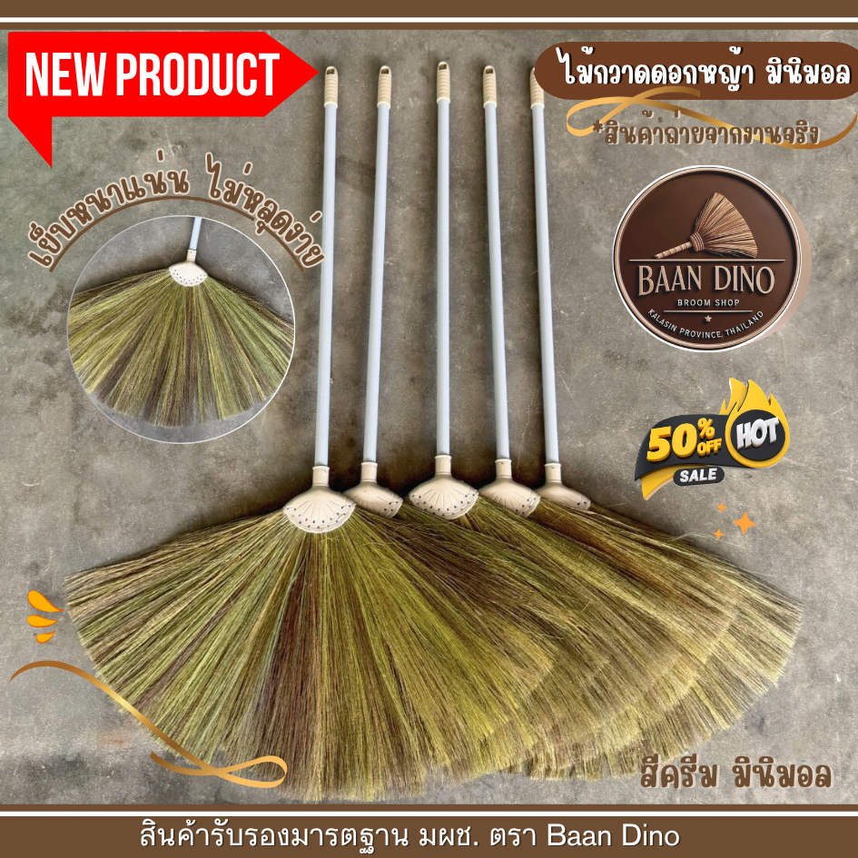 OTOP ไม้กวาดดอกหญ้ารุ่นหนาพิเศษทากาว ตัดปลาย (มินิมอล) Baan Dino บ้านไดโน แน่น ทนทาน ดอกหญ้าเกรดพิเศษ ไม่มีเศษดอก