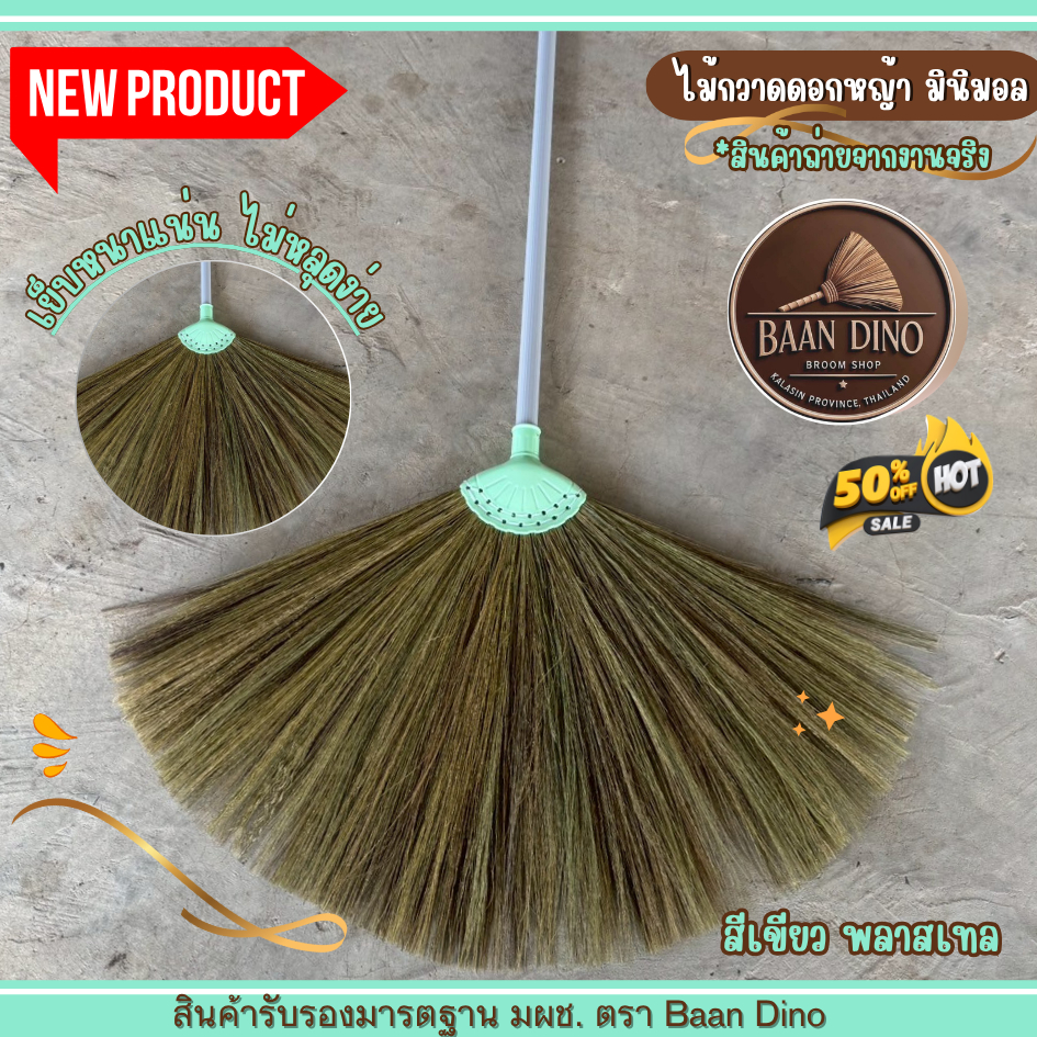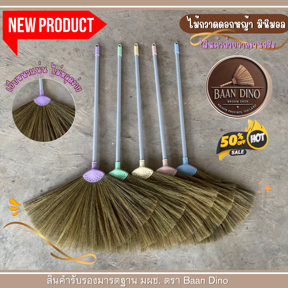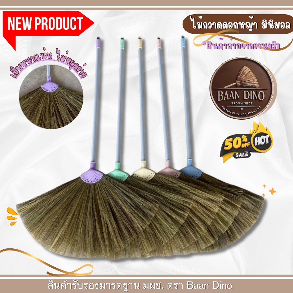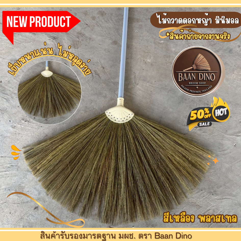OTOP ไม้กวาดดอกหญ้ารุ่นหนาพิเศษทากาว ตัดปลาย (มินิมอล) Baan Dino บ้านไดโน แน่น ทนทาน ดอกหญ้าเกรดพิเศษ ไม่มีเศษดอก