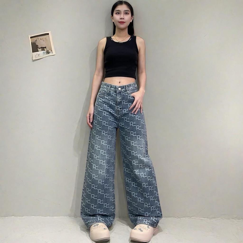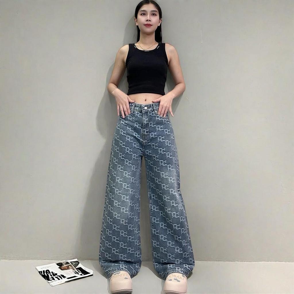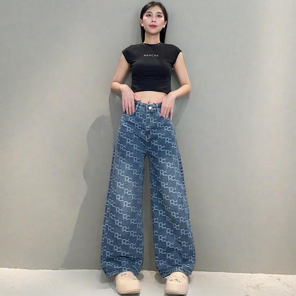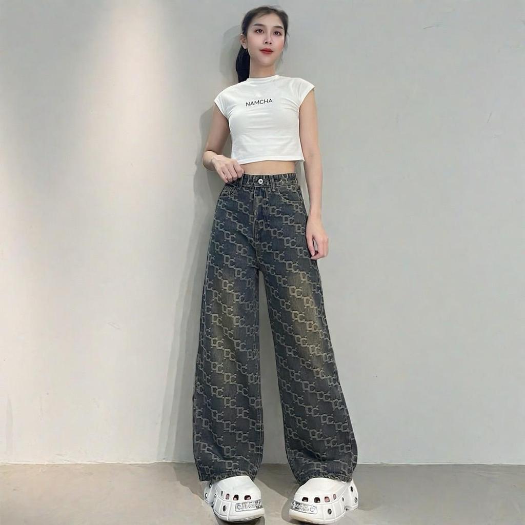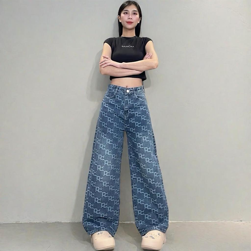 NAMCHA กางเกงยีนส์ทรงกระบอก กางเกงยีนส์เอวสูง ผ้าทอลายcc 390 391 3886