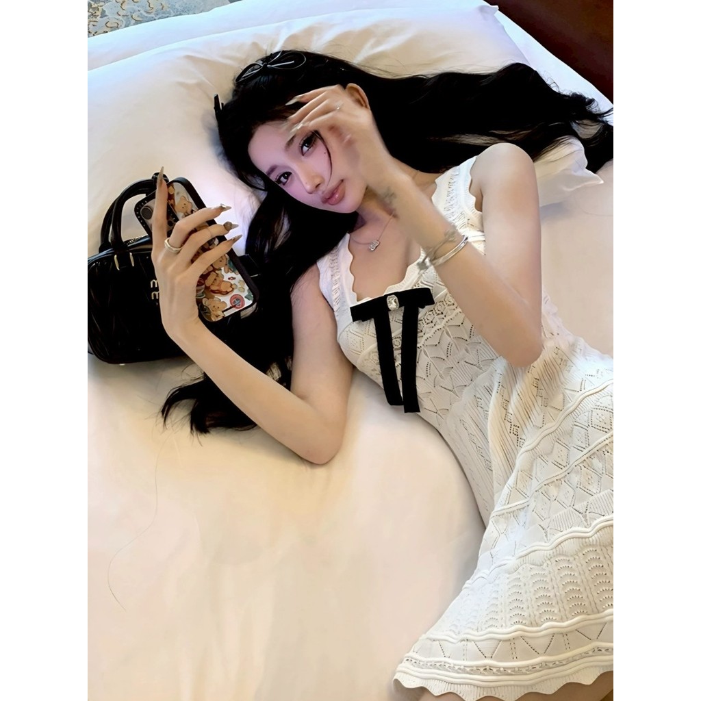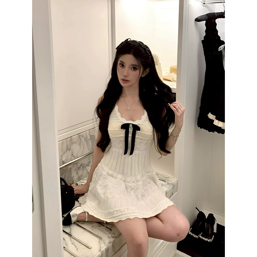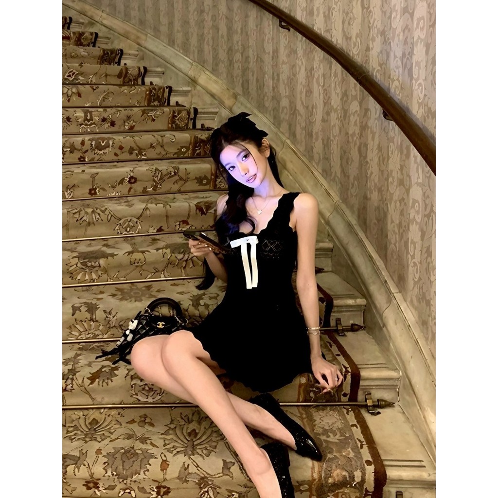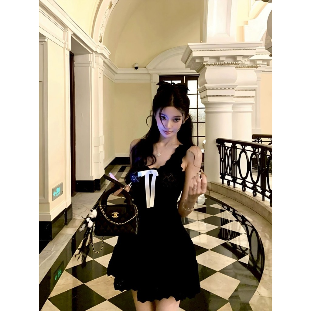 Nemo store?#W-N096-1 ชุดมินิเดรส ผ้าไหมพรม แขนกุด ทรงรัปรูปแต่งโบว์