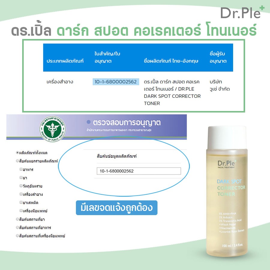 โทนเนอร์เช็ดฝ้า : Dr.Ple Toner ผลัดผิว ฝ้า กระ ผิวคล้ำ (ของแท้บริษัท) ส่งตรวจสารแล้ว 100 ml