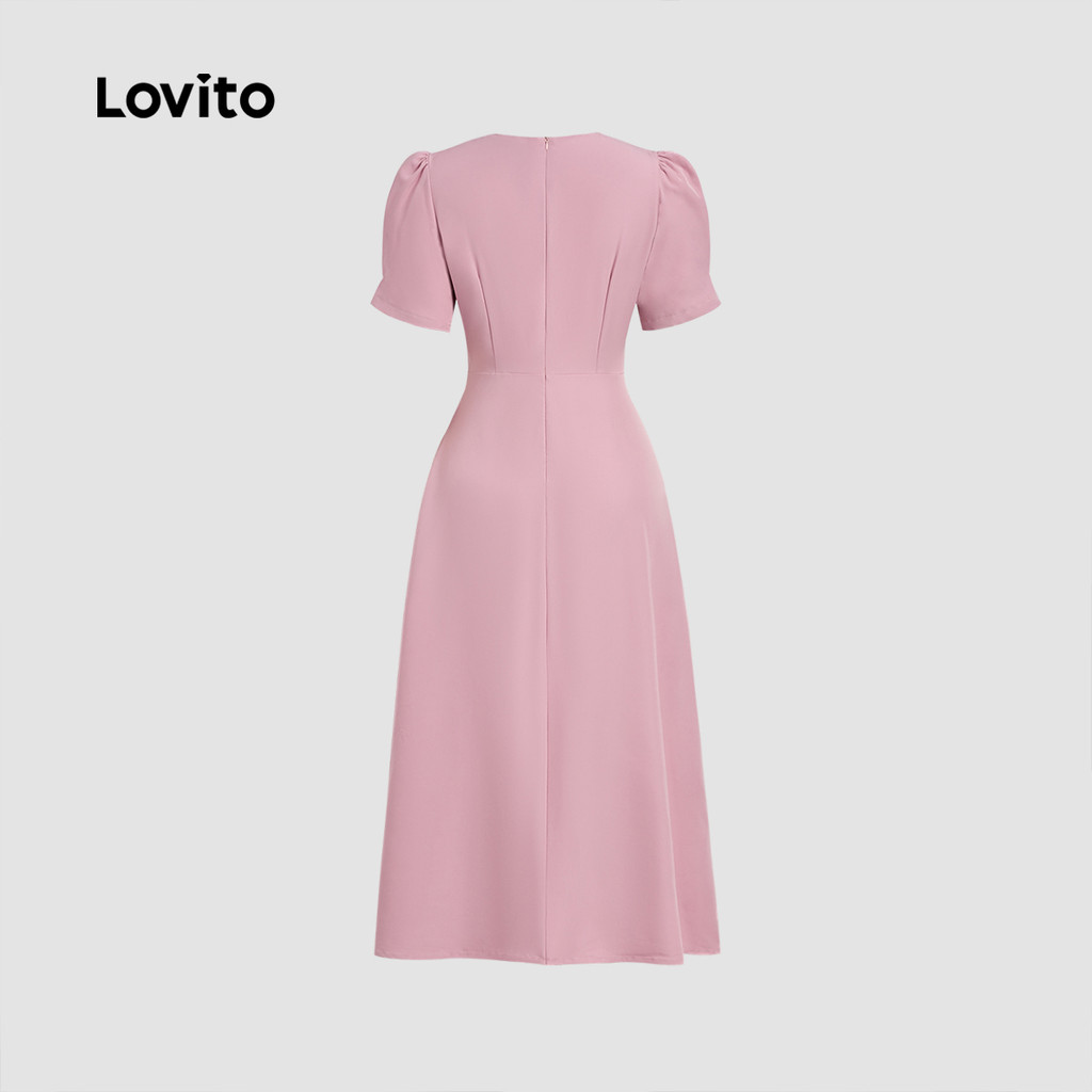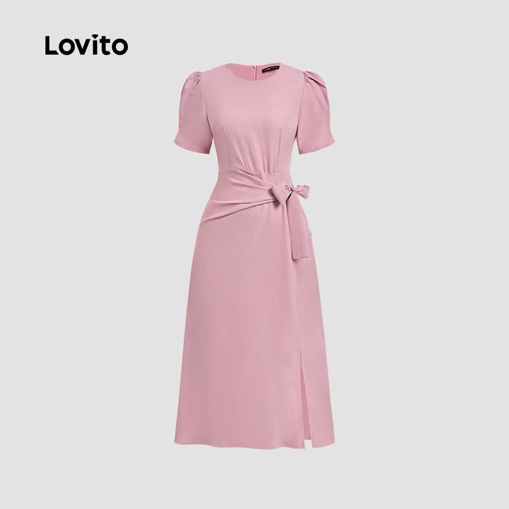 Lovito เดรสยาวสวยหรูสำหรับใส่ทำงาน ดีไซน์คลาสสิกและใช้งานได้หลากหลาย ผูกโบว์ด้านหน้า ผ่าข้าง สีเทาชมพู สำหรับผู้หญิง เหมาะสำหรับฤดูใบไม้ผลิ/ฤดูร้อน L138ED433