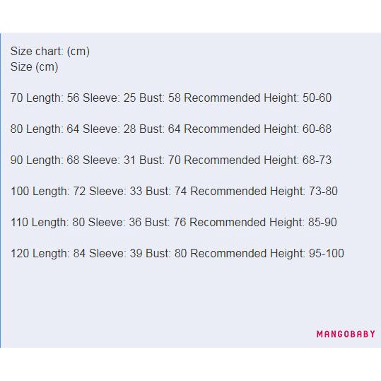 0-3M ความยาว: ความยาว: 50 หน้าอก: 48 แขนเสื้อ: 23 ไหล่กว้าง: 19 สะโพก: 54 ความยาวช่วง: ช่วงความยาว: 37 อายุที่แนะนำ: 0-3 เดือน