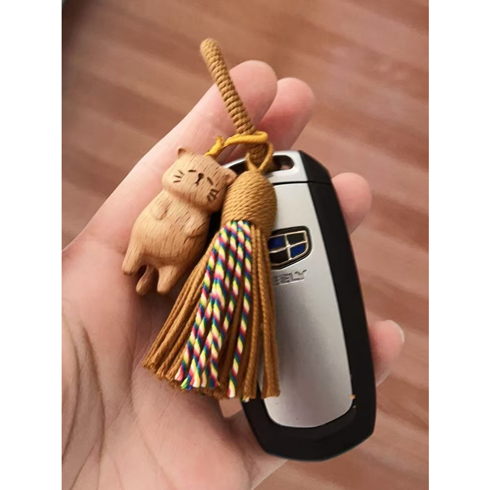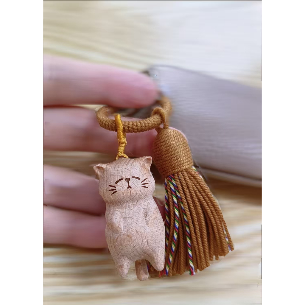 ไม้เนื้อแข็งแมวแหวนกุญแจจี้ Beech Cat Flow พวงกุญแจจี้ไม้แกะสลักแมวจี้น่ารักกระเป๋าจี้นักเรียนคู่กระเป๋านักเรียนจี้ W