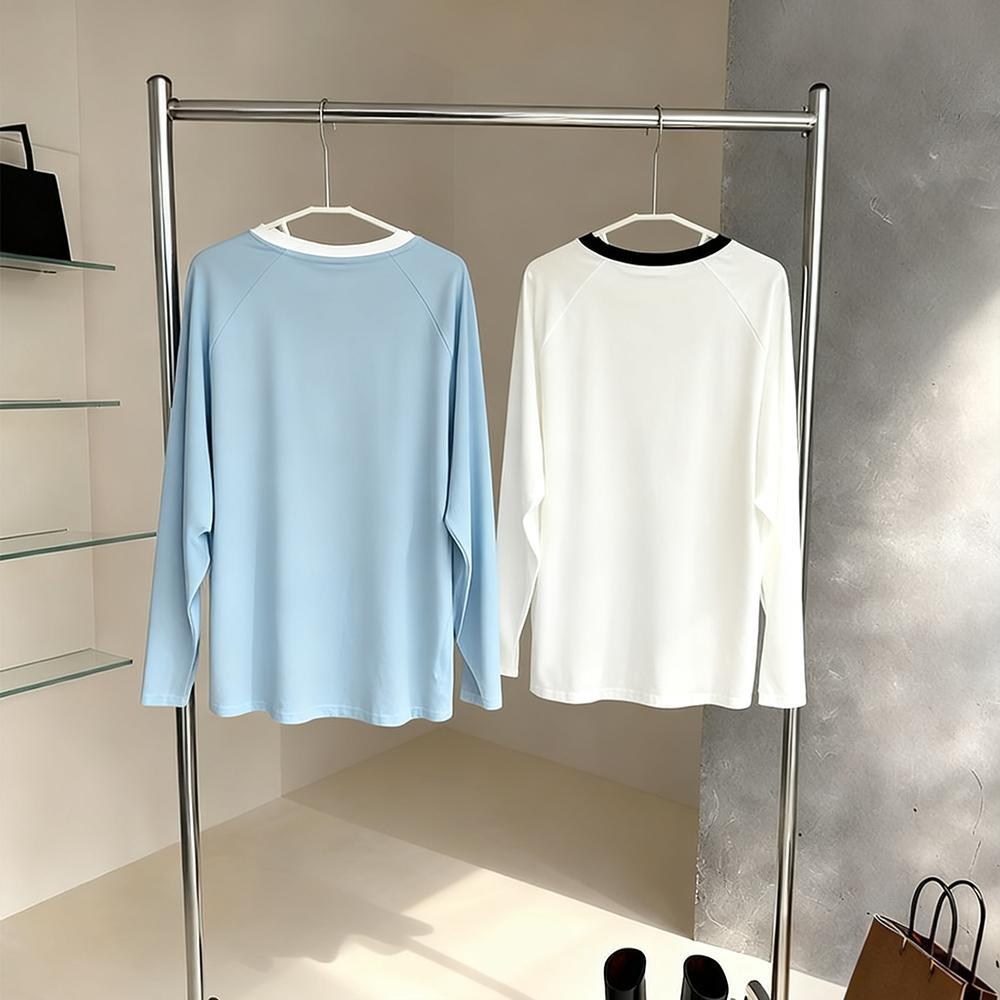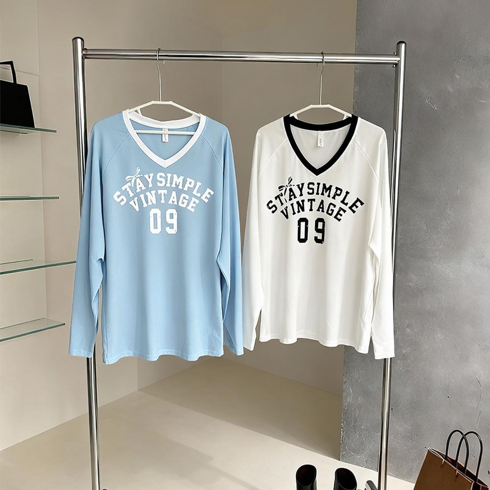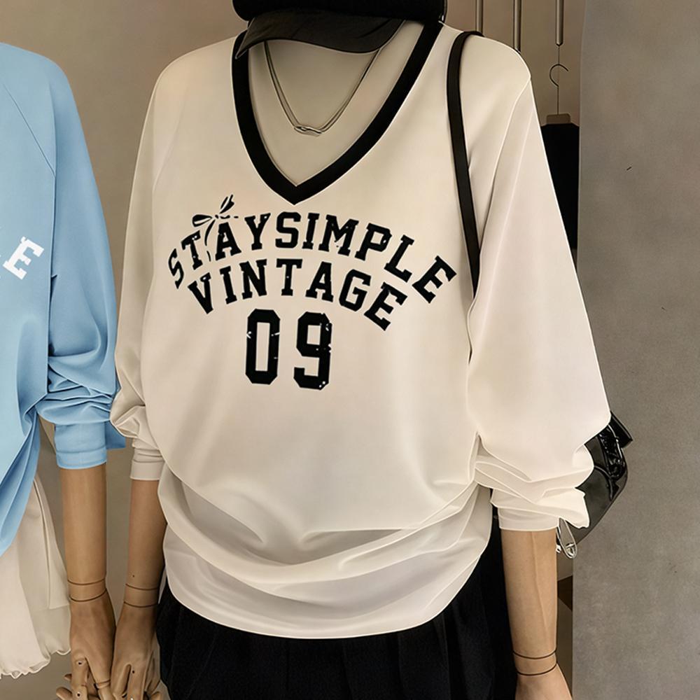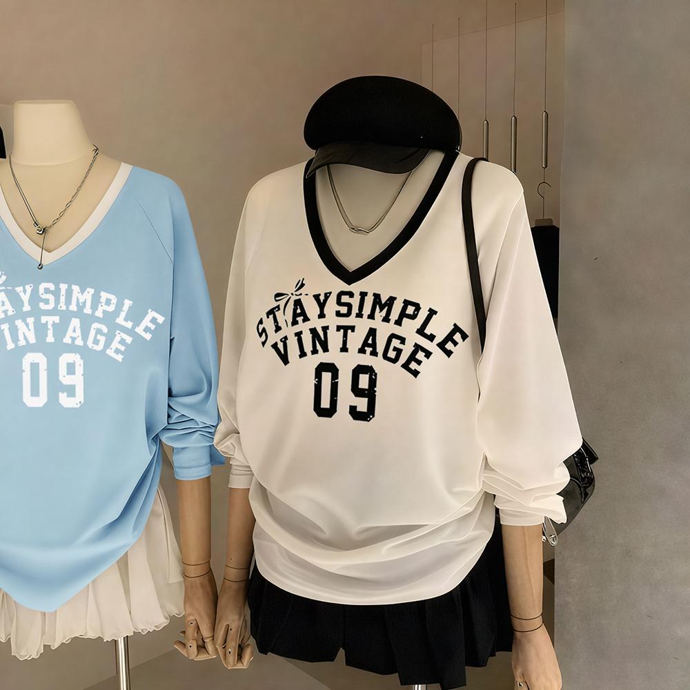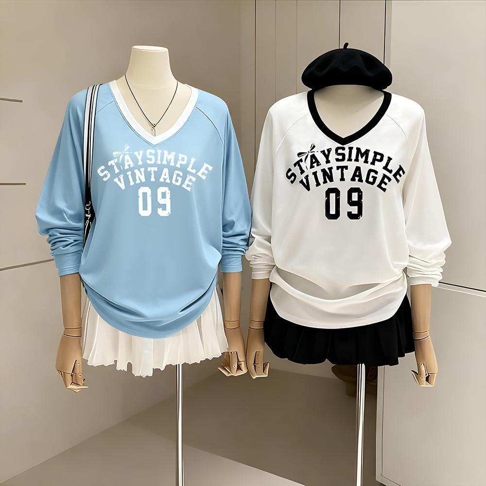 [เสื้อยืด ขนาดใหญ่เกินไป] (40-150กิโลกรัม) ผู้หญิงแขนยาวขนาดบวกบางคอวี บล็อกสี พิมพ์ด้านบนออกแบบเฉพาะเสื้อยืด