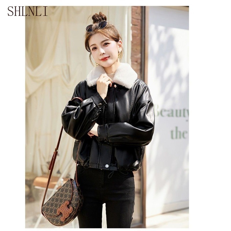 แจ็คเก็ตขนแกะสำหรับผู้หญิง ทำจากหนัง สไตล์หลวม สบาย ๆ เหมาะสำหรับฤดูหนาว