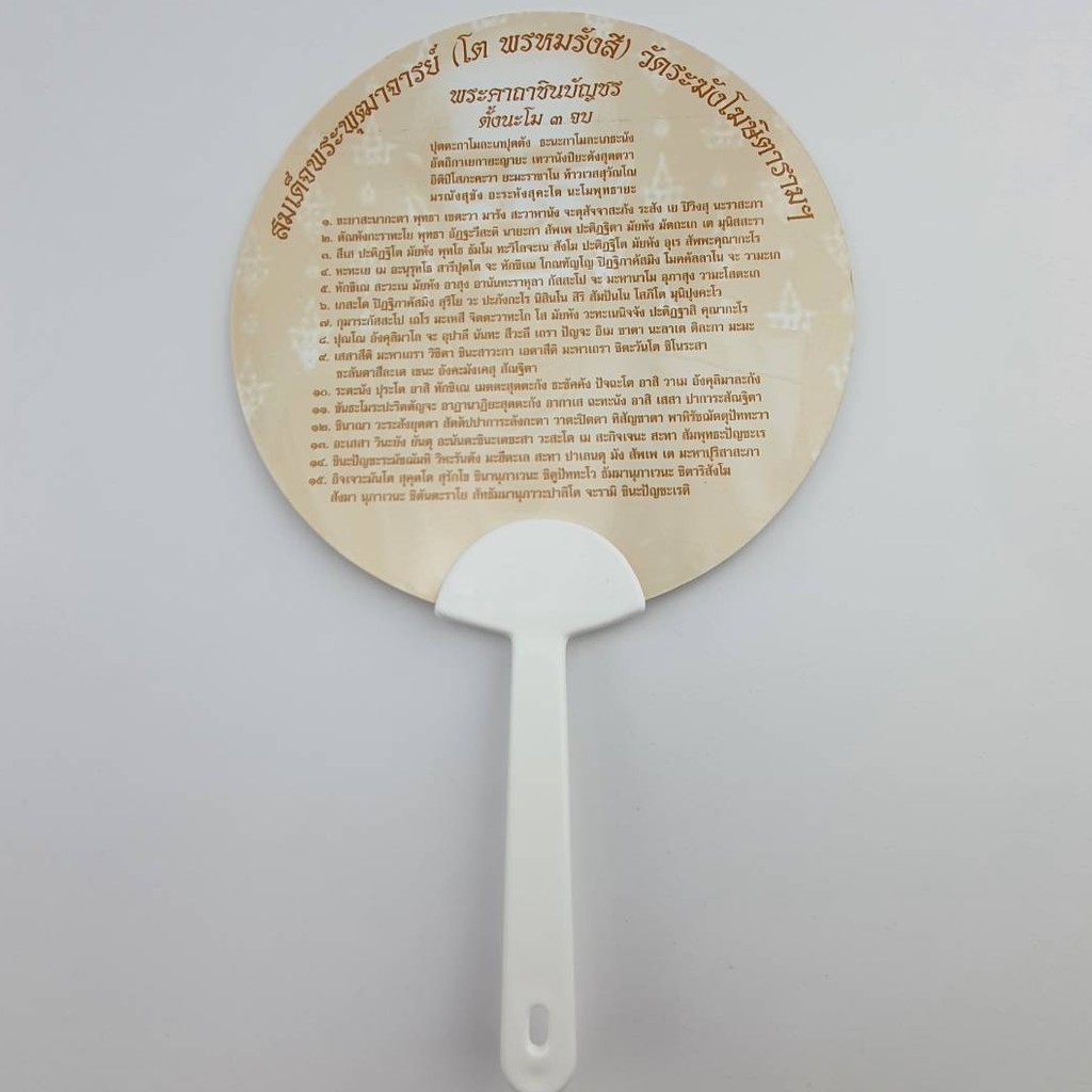 พัดบทสวดมนต์ F001 คาถาชินบัญร+คาถาเงินล้าน ไซส์เส้นผ่าศูนย์กลาง 6.50 นิ้ว อาร์ตการ์ด 420 แกรม พิมพ์ทอง พร้อมเคลือบพลาสติกเงากันน้ำ ด้ามสีขาว (แบ็คกราวน์พื้นหลังเป็นหลวงปู่โต พรหมรังสีจางๆ)
