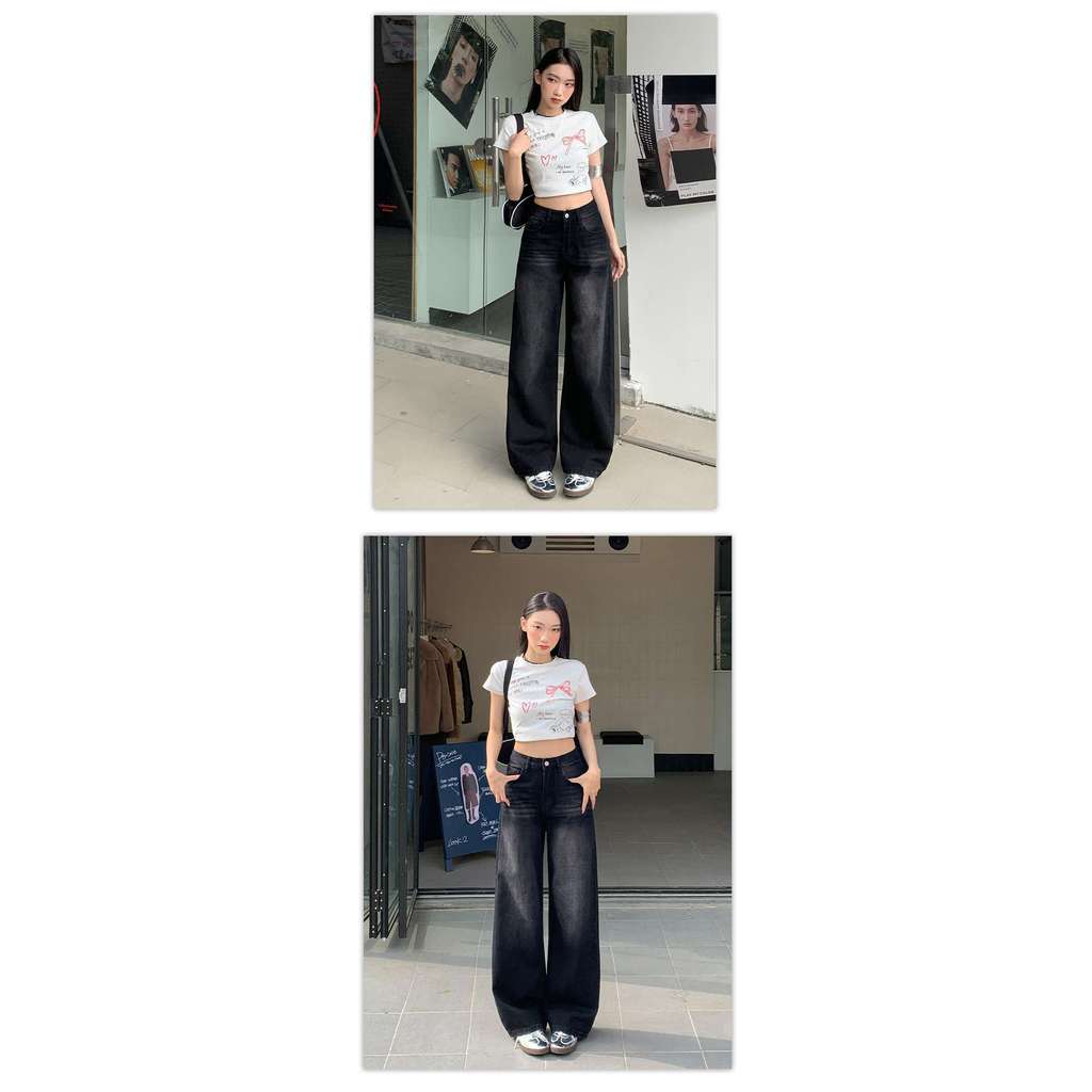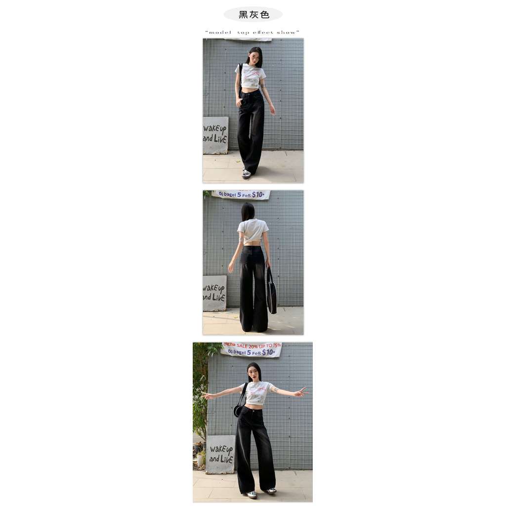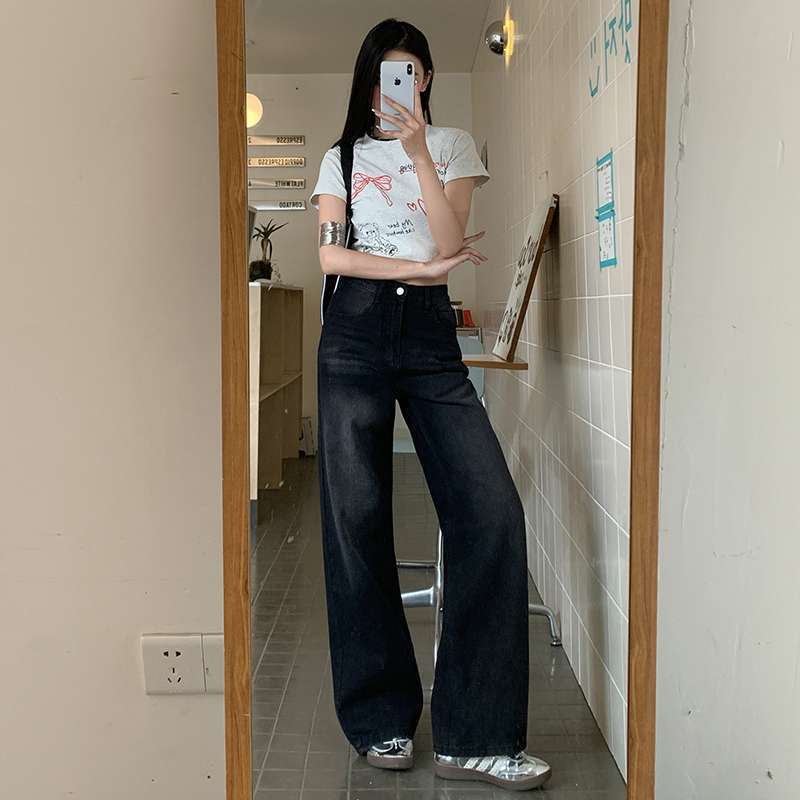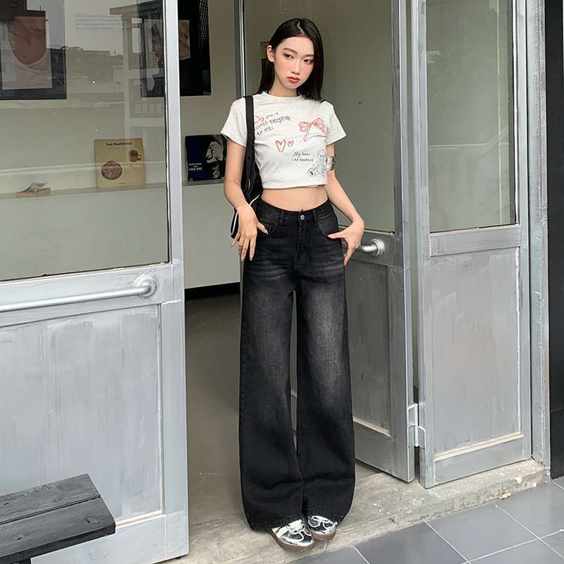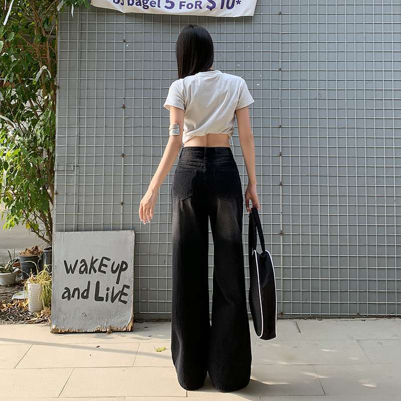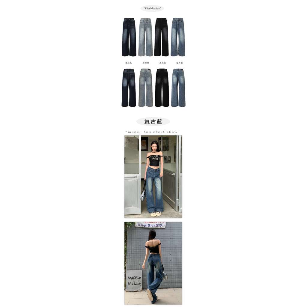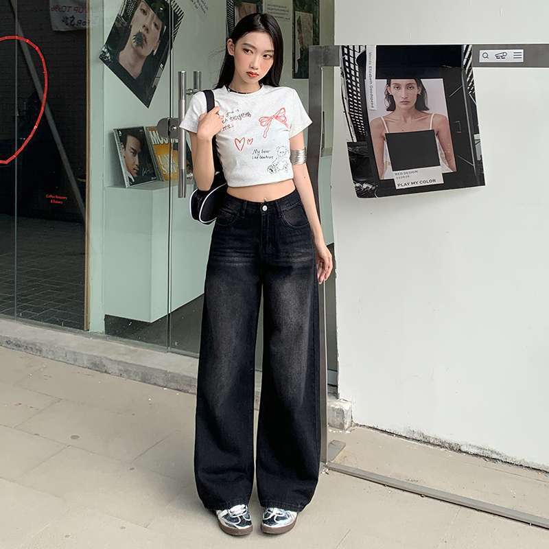 ความรู้สึกผ่อนคลาย กางเกงยีนส์ขากว้าง ผู้หญิงฤดูใบไม้ผลิฤดูร้อนหลวม กางเกงวินเทจ Mop