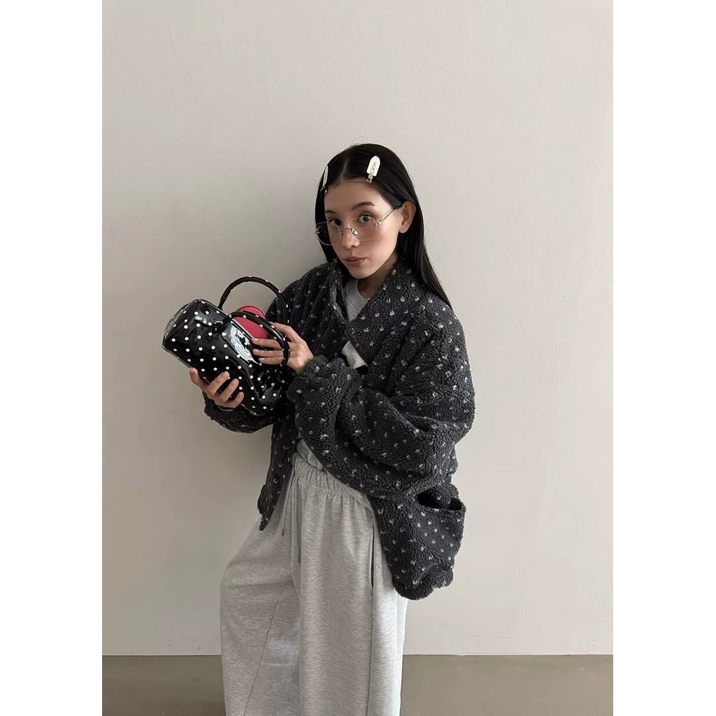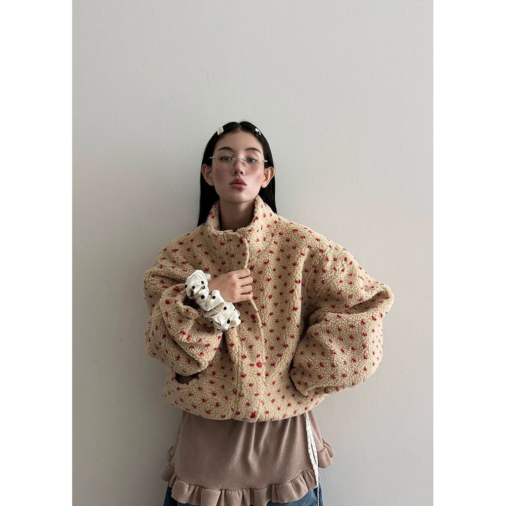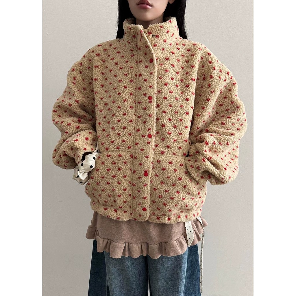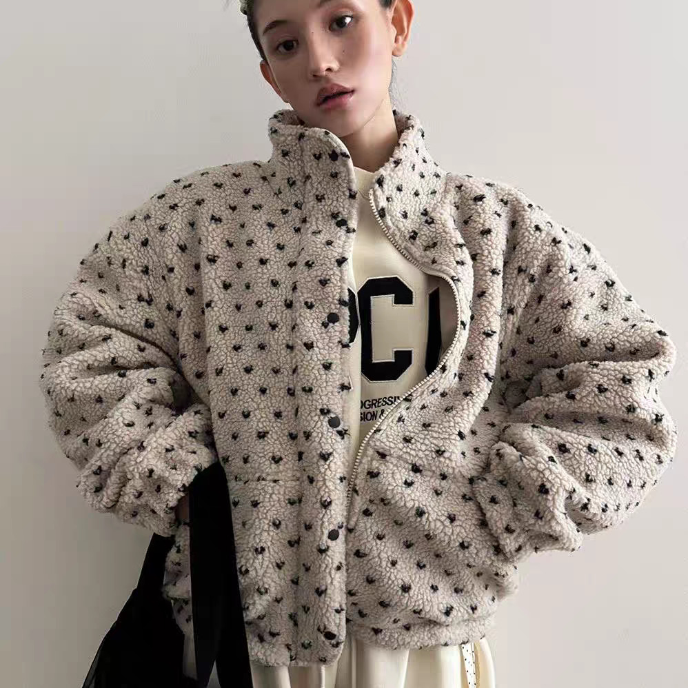 แจケットสไตล์เกาหลีสีพอลคอดوت 4 สี คอกระดุกตั้ง อุ่นๆ จากขนแกะ