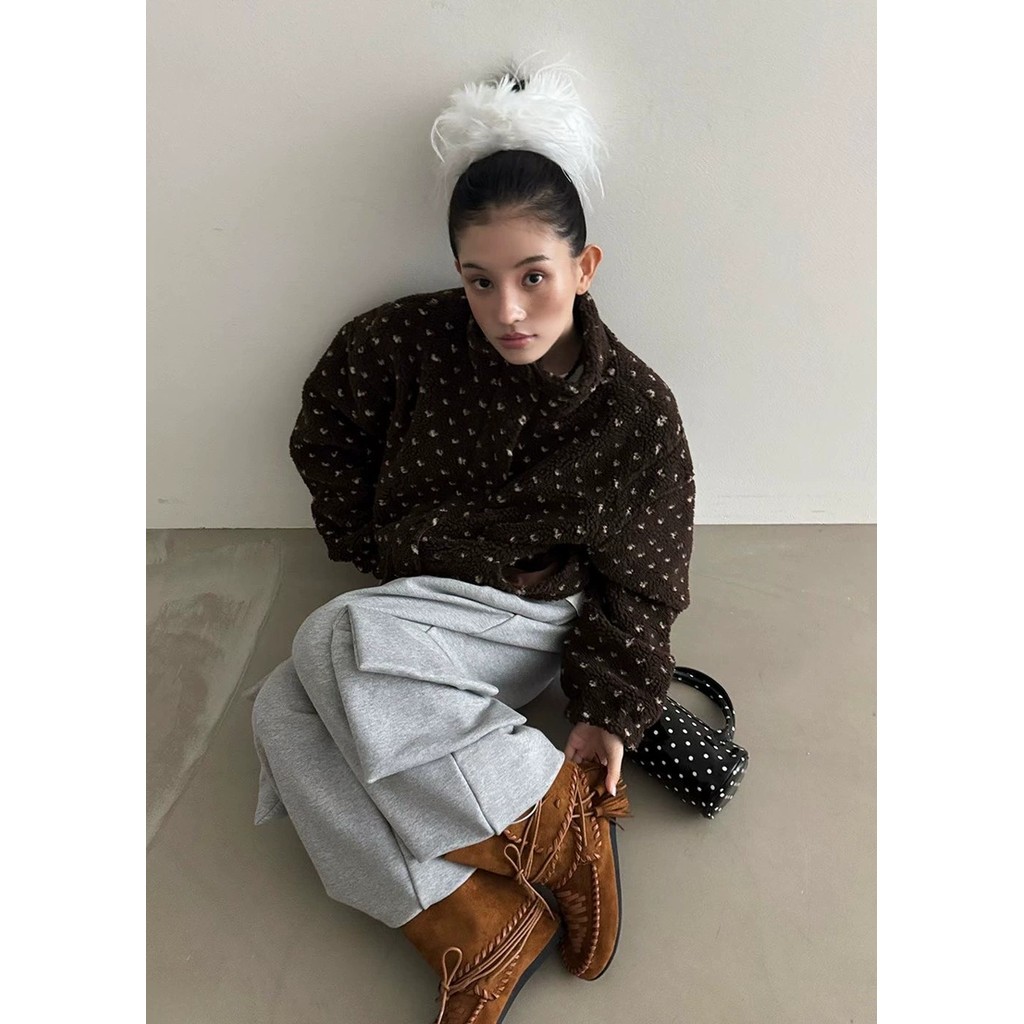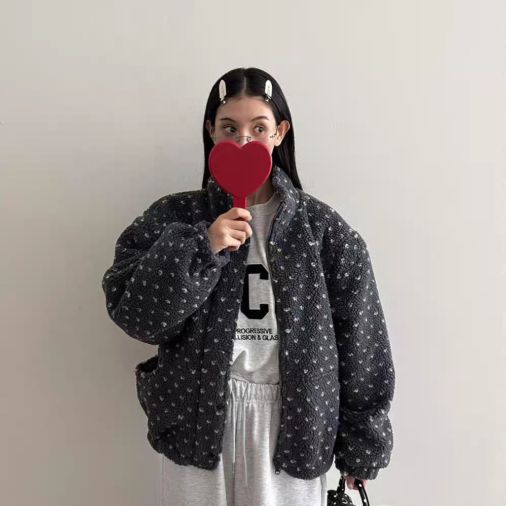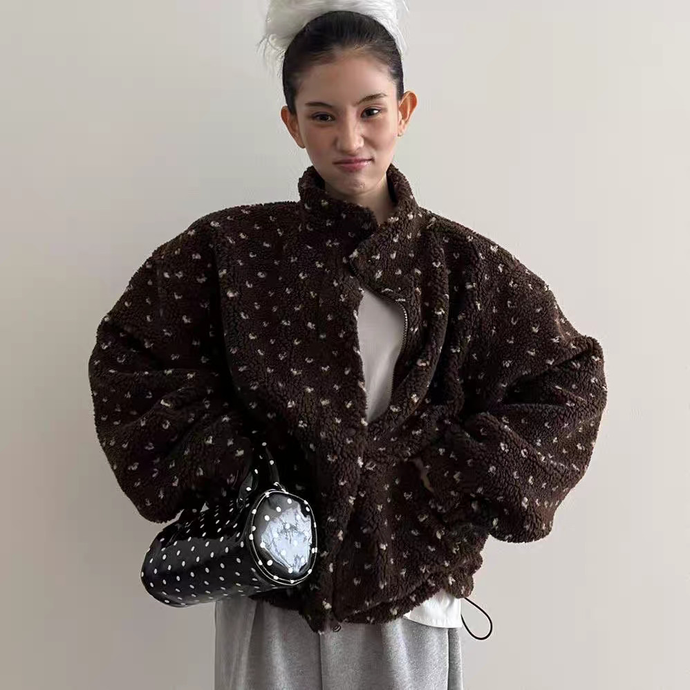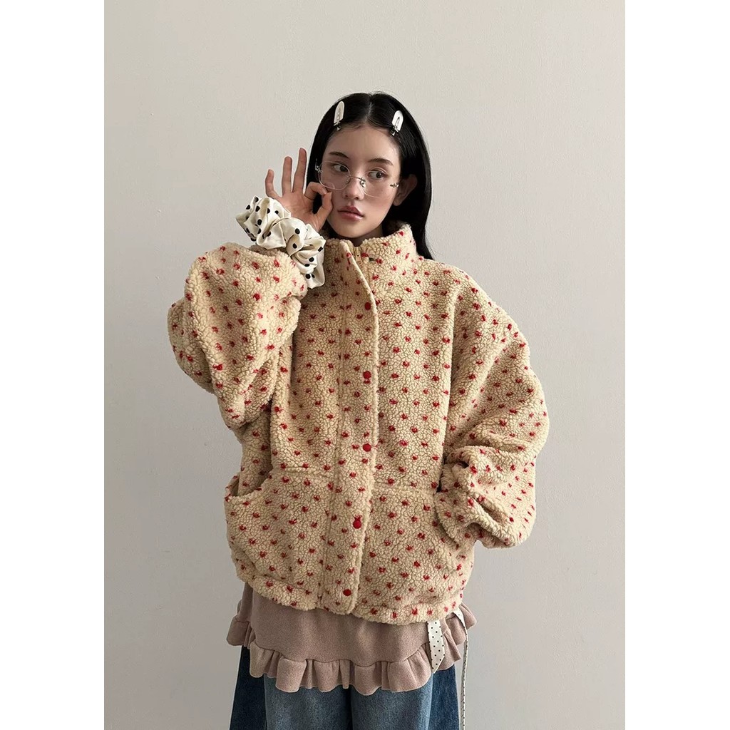 แจケットสไตล์เกาหลีสีพอลคอดوت 4 สี คอกระดุกตั้ง อุ่นๆ จากขนแกะ