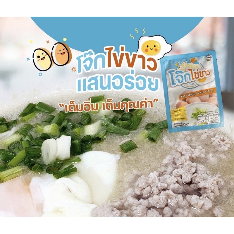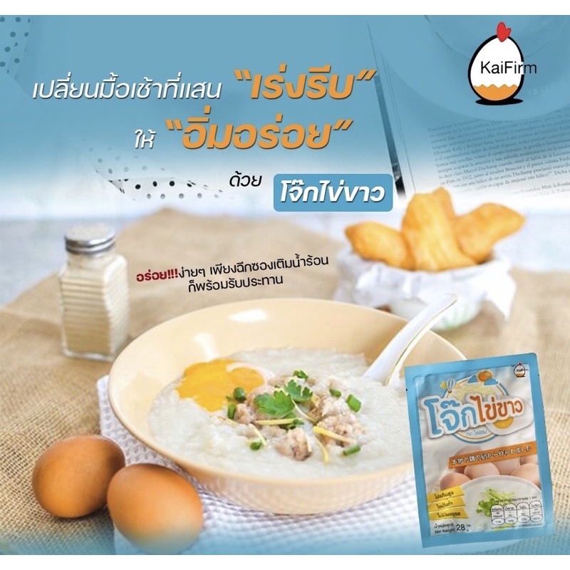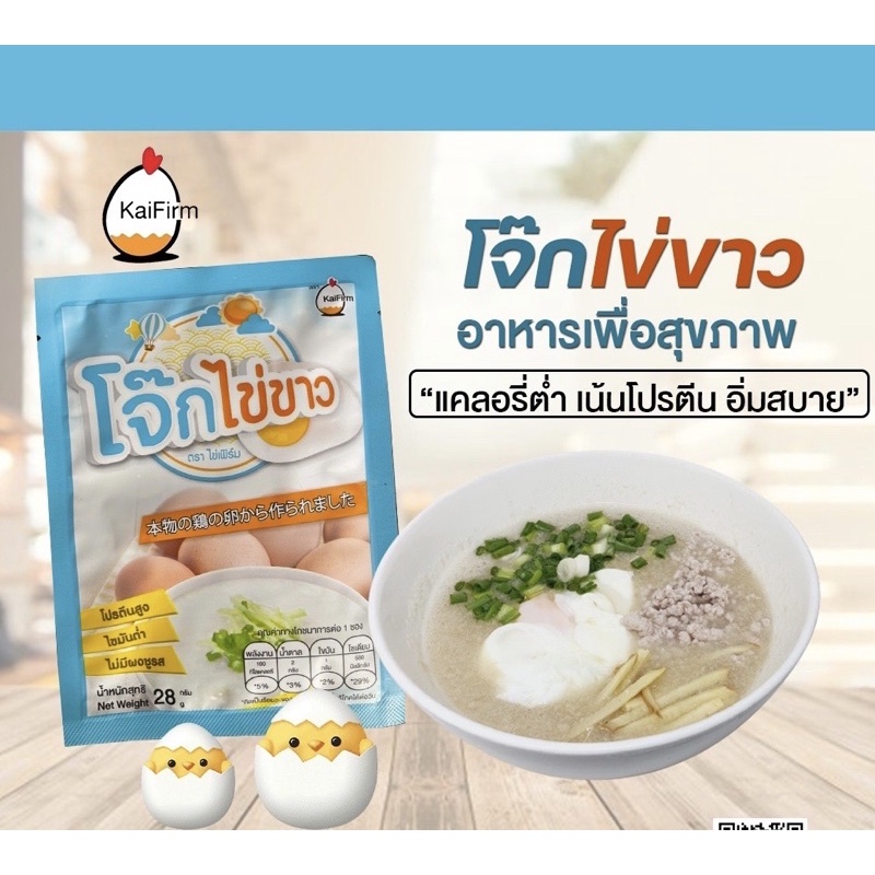 #โจ๊กไข่ขาวกึ่งสำเร็จรูป (Kaifirm) #Protein 12 g #ไขมันต่ำ #แคลอรี่ต่ำ 100 kcal #คาร์โบรไฮเดรต 11 g #ไม่มีผงชูรส พร้อมคุณค่าทางโภชนาการที่สมบูรณ์ วิตามินบี และ กรดอะมิโนที่จำเป็น #ราคาซองล่ะ 49บาท #น้ำหนัก 28 กรัม #โจ๊กไข่ขาวกึ่งสำเร็จรูป (Kaifirm)