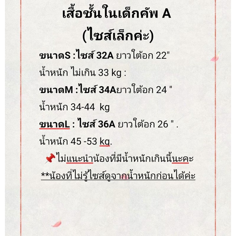 ???ก่อนกดสั่งอ่านรายละเอียดสินค้าก่อนนะคะ เสื้อชั้นในเด็กคัพ A รอบตัวไม่ยาว​ ลูกค้าตัว​อ้วนน้ำหนักเกิน​53 กก.​ ไม่แนะนำค่ะ รุ่นคัพ Aรอบตัวจะสั้นกว่า คัพB, ?แต่งด้วยโบและหัวใจเปลื่ยนไปตามแต่ละครั้งที่ร้านรับมานะคะ เสื้อชั้นในคัพ, A ขนาดเล็กแล้วสั้น​ น้อ
