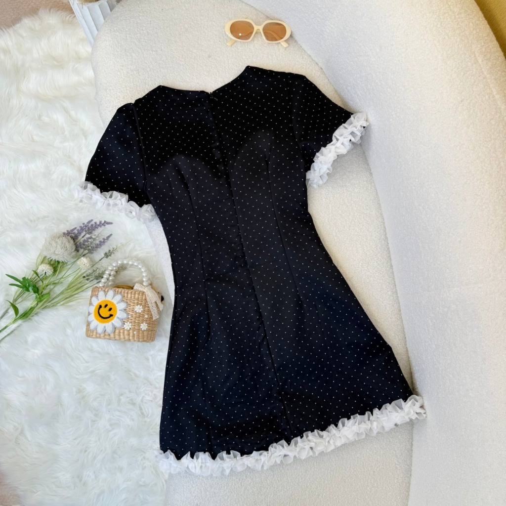 A1230 ชุดเดรสกระโปรงคอกลมแขนสั้นดีเทลแต่งระบายลายโพกาดอทสวยหรูลุคคุณ ใส่ออกงาน ดินเนอร์ คาเฟ่"]
