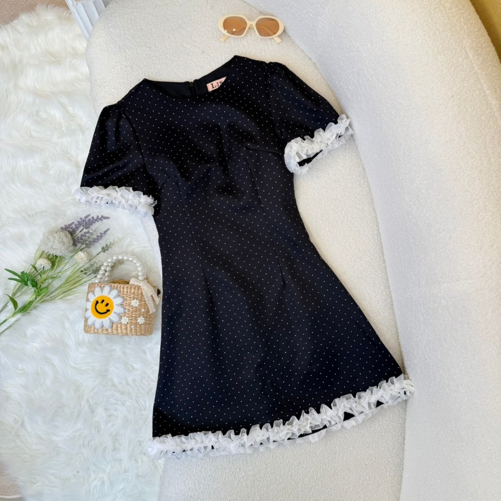 [LISA] A1230 ชุดเดรสกระโปรงคอกลมแขนสั้นดีเทลแต่งระบายลายโพกาดอทสวยหรูลุคคุณ ใส่ออกงาน ดินเนอร์ คาเฟ่