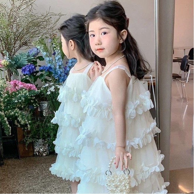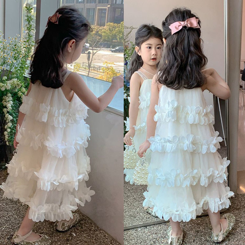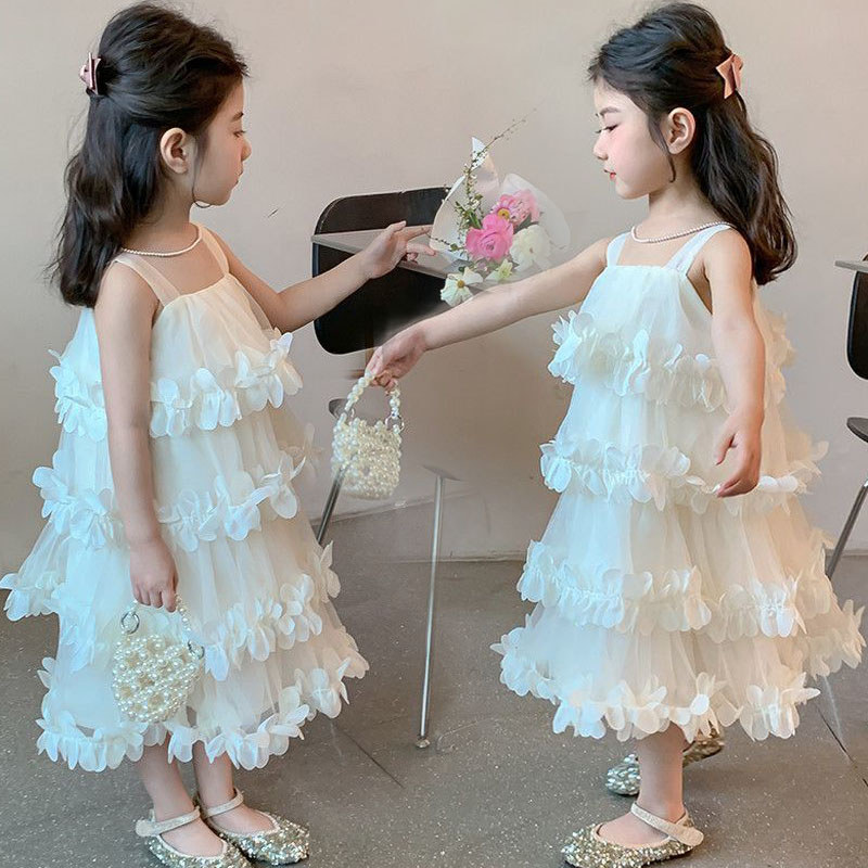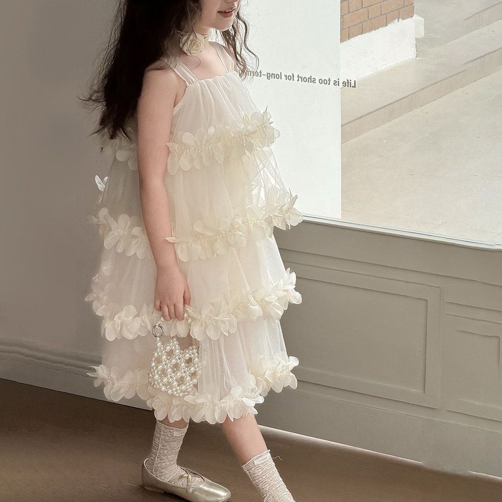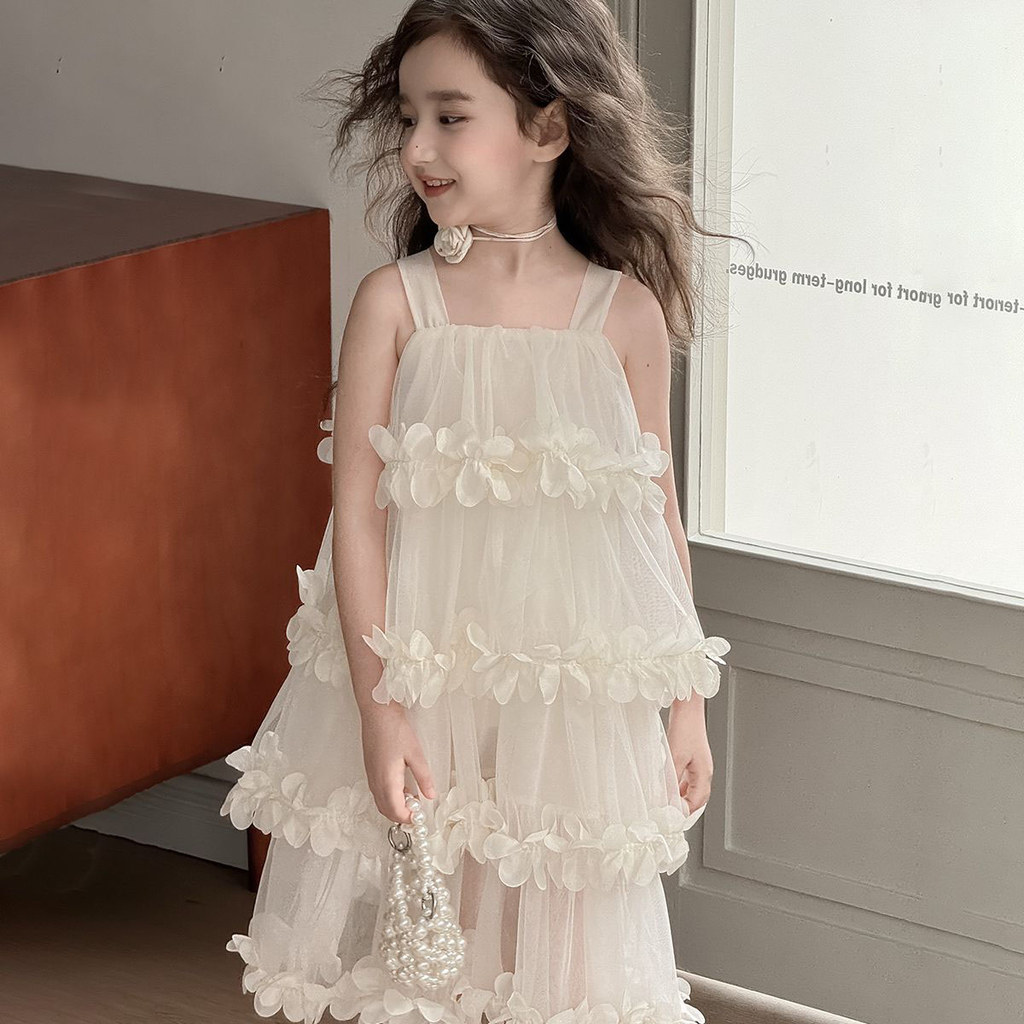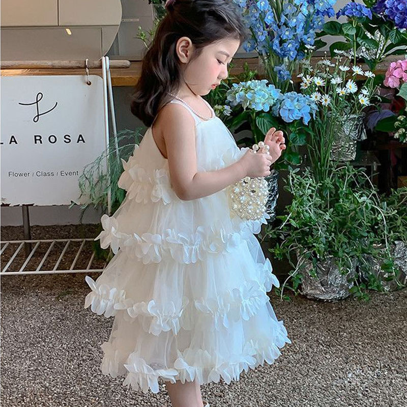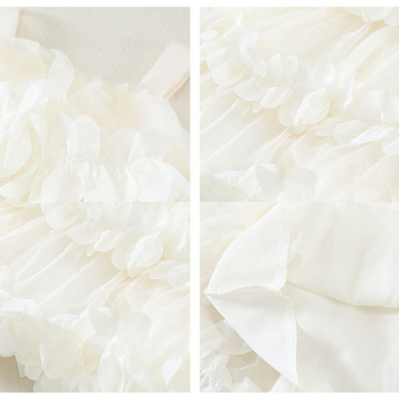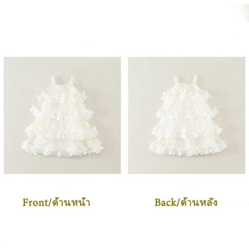 [ชุดเดรสเด็กผู้หญิง] เอวลอย ผ้าตาข่าย ลายระบายดอกไม้สามมิติ สีขาว ขาวอบอุ่น ใส่ถ่ายรูป งานวันเกิด งาน