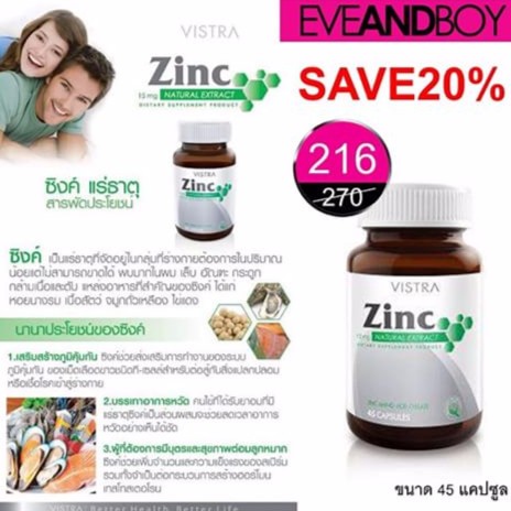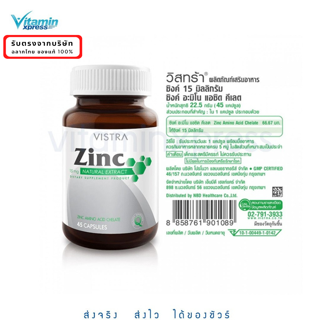 Exp.03/28 Vistra Zinc 15mg Natural Extract 45 capsules วิสตร้า สังกะสี เล็บ ผม