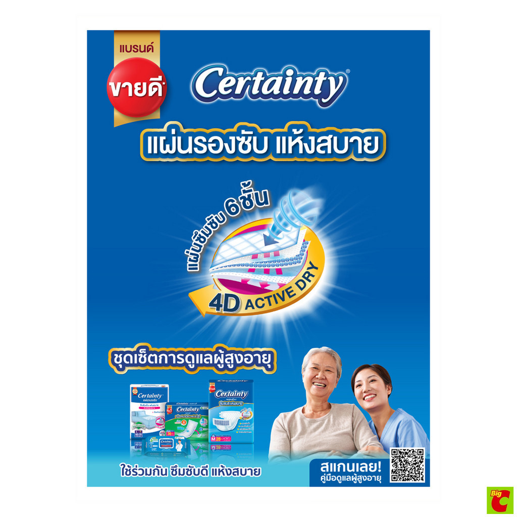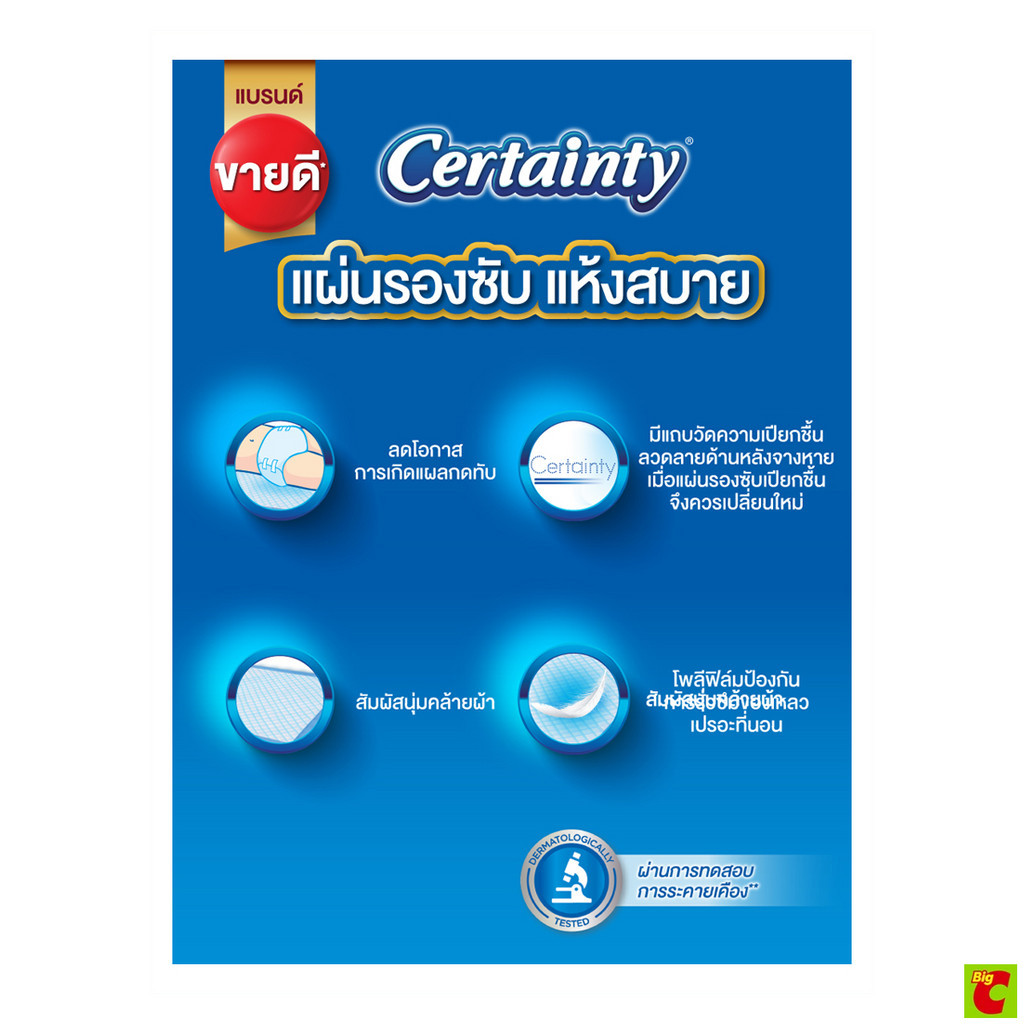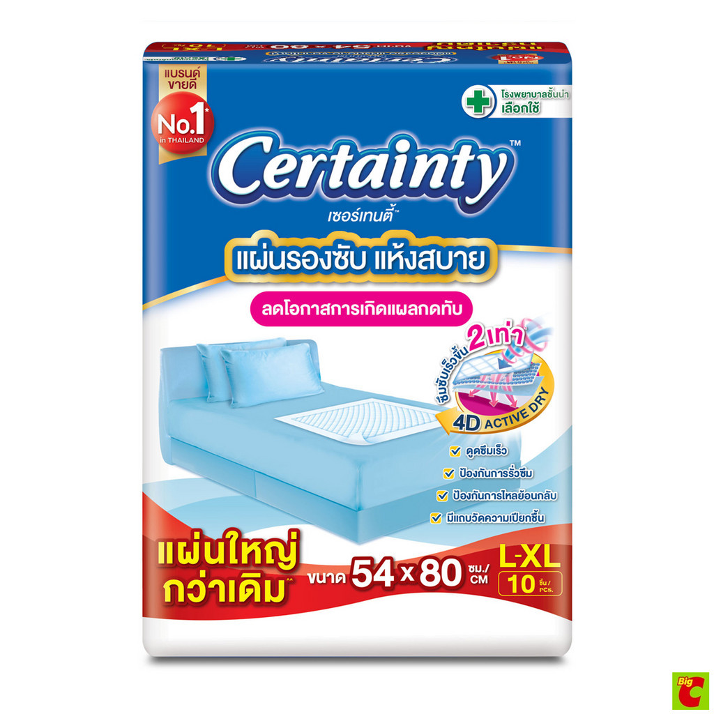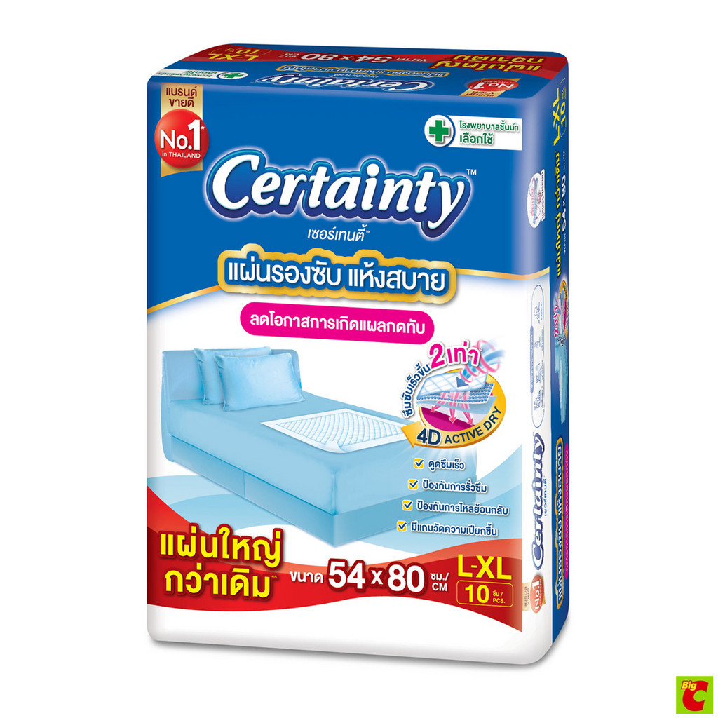 เซอร์เทนตี้ แผ่นรองซับที่มีคุณสมบัติคุณภาพที่โรงพยาบาลทั่วไปเลือกใช้ มีชั้นซึมซับพิเศษหนานุ่ม 6 ชั้น จึงดูดซับของเหลวได้มาก สิ่งสกปรกจึงไม่เปรอะเปื้อนที่นอน ผิวหน้าสัมผัสนุ่มคล้ายผ้าแห้งสบาย จึงลดโอกาสการเกิดแผลกดทับ พร้อมมีเม็ดเ