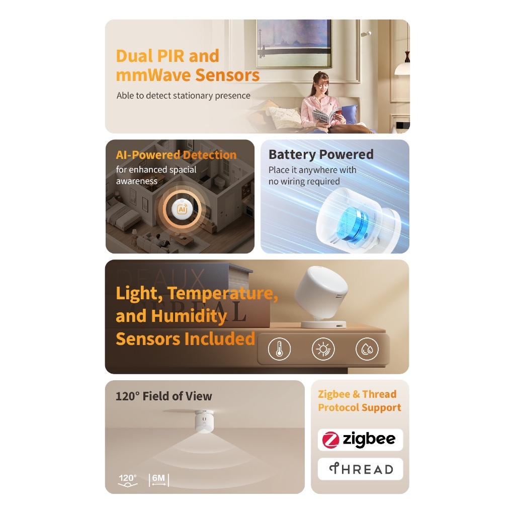 - ตรวจจับการมีตัวตนอย่างแม่นยำด้วย AI เทคโนโลยีตรวจจับแบบคู่ (อินฟราเรด + เรดาร์คลื่นมิลลิเมตร 60GHz) จับการเคลื่อนไหวได้ละเอียดแม