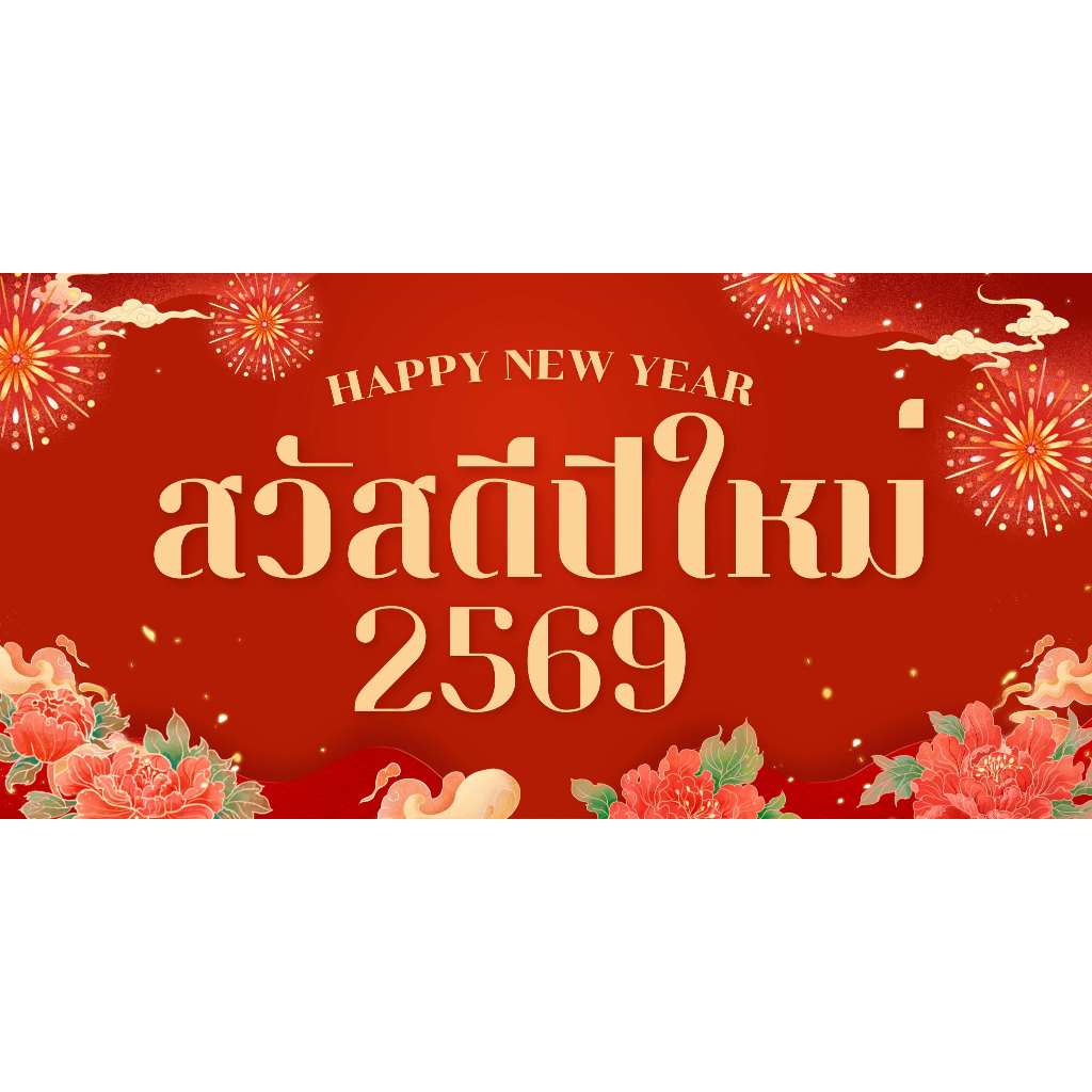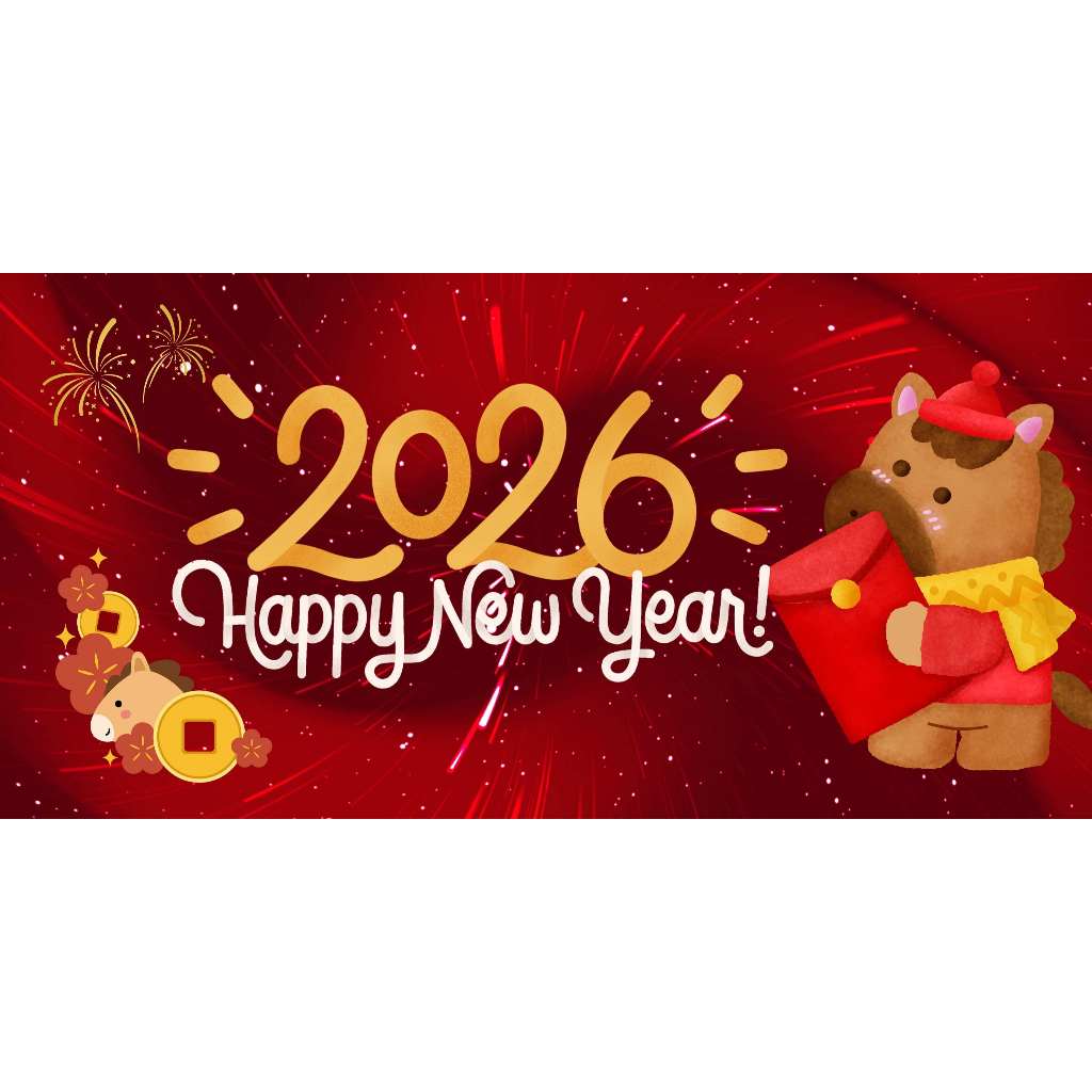 ป้ายไวนิลสวัสดีปีใหม่ 2569 ป้ายปีใหม่ ปีมะเมีย ป้ายไวนิลราคาถูก สีสดใส ทนแดด แก้ไขได้ออกแบบฟรี