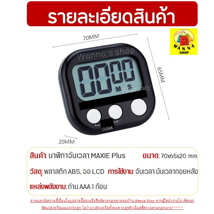 นาฬิกาจับเวลาอัจฉริยะ MAXIE !! พร้อมจับเวลา(เดินหน้าและถอยหลัง) ได้สูงสุดถึง 99 นาที 99 วินาที มีให้เลือกซื้อถึง 7 สี ได้แก่ ฟ้า ชมพู ส้ม เขียว ขาว ดำ(ปุ่มขาว) ดำ(ปุ่มแดง) ชมพู เป็นต้น