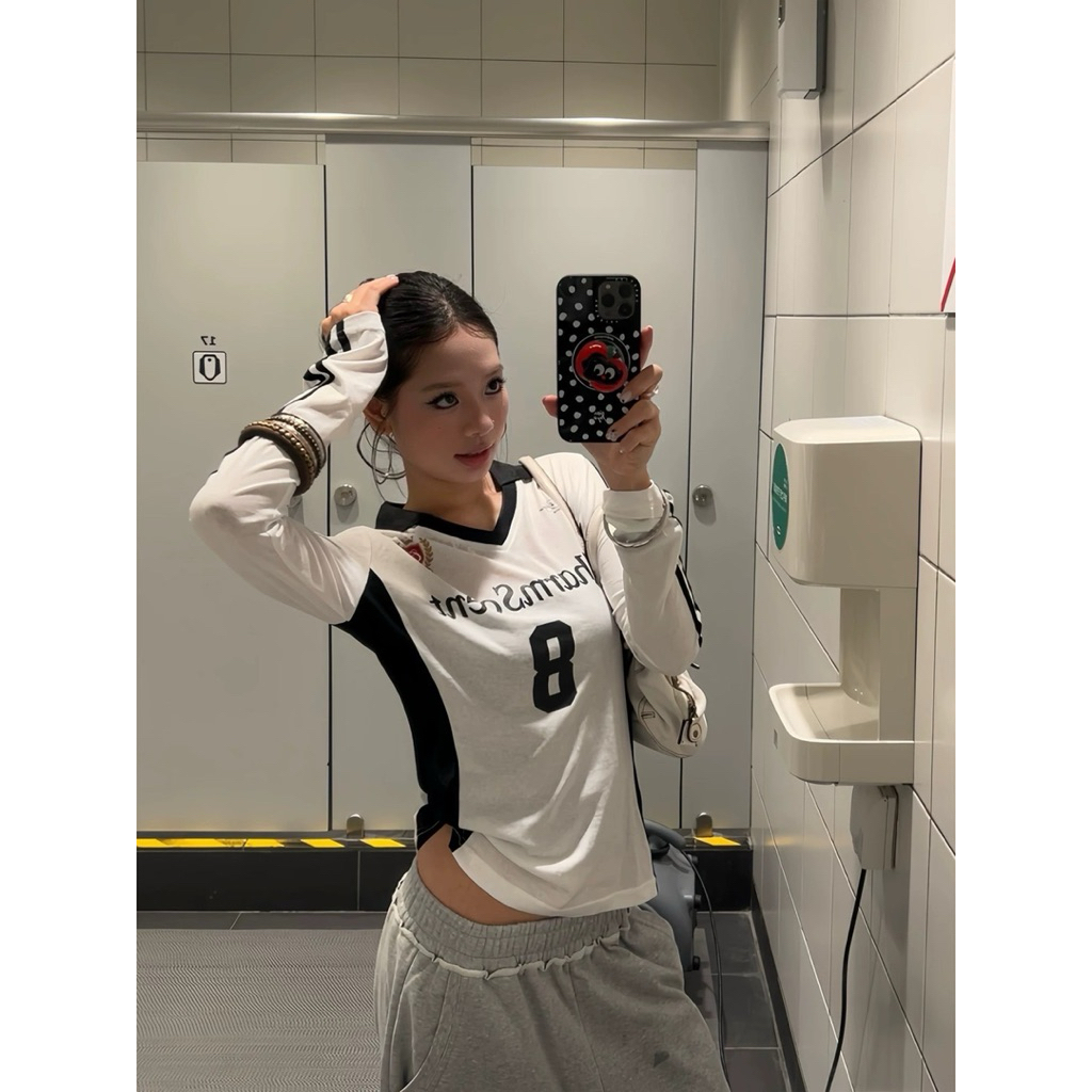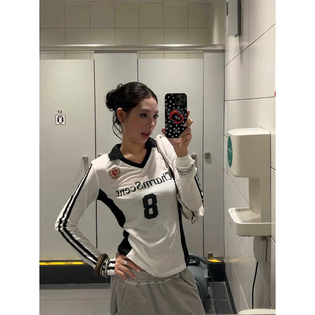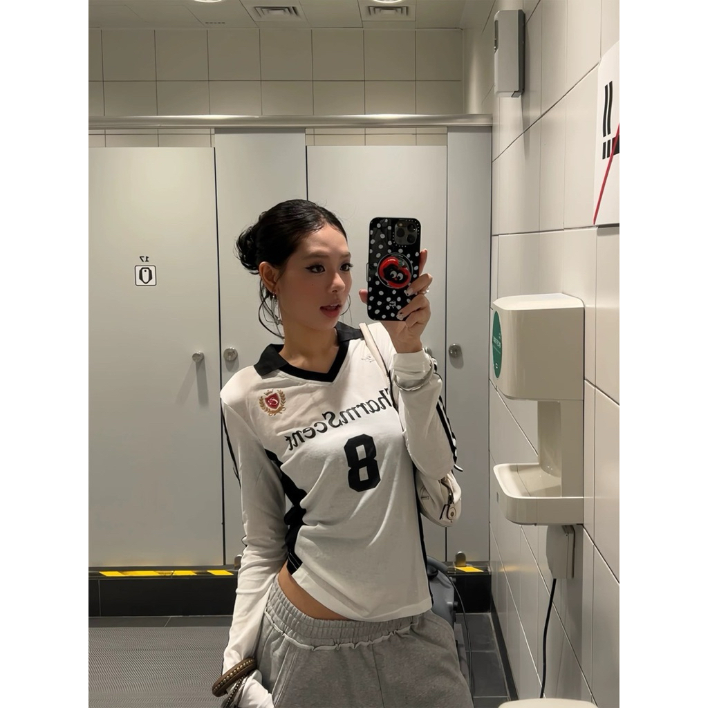 7631# เสื้อแขนยาวคอปก สกรีนลายช่วงอก เนื้อผ้าดี ทรงสวย